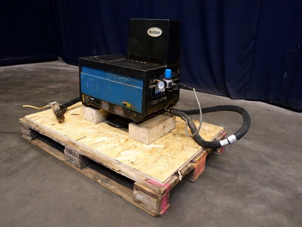 Hotmelt unit with 1 outgoing hose. Length of the hose: 120 cm. 2 glue dosing nozzles.