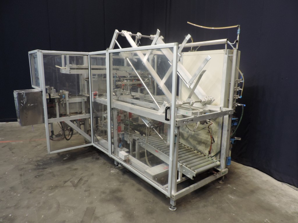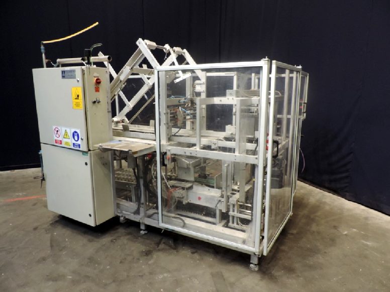 Wrap around packer for margarine bricks of 500 gram. Packscheme: 2 X 4 X 3 . Dimensions of the box: 22 X 30 X 26 Mm. without hotmelt unit. Infeed conveyor missing, rolling outfeed conveyor. Control panel with PLC control (Siemens S7), without Operation panel. Has been running together with a SIG FD140 machine (stn12959). Outside measurements: 2,8 x 2,7 x 2,2 mtr.