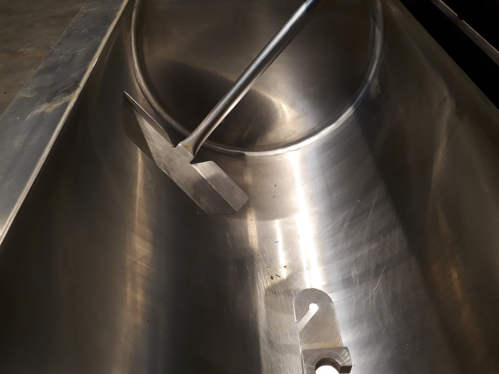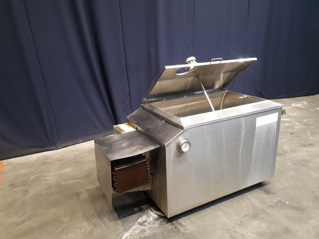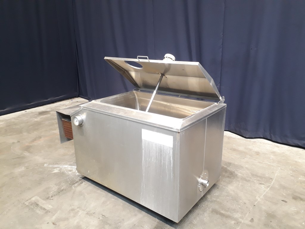 Former farm tank, used as water buffer tank. Horizontal. Top propellor agitator, motor: 120 W - 48 rpm - 220 V - 0,8 A. Insulated. Pressure in tank atmospherique. Temperature indicator. Including cooling unit. Inner dimensions of tank: 110 x 65 x 65 cm. Outer dimensions 190 x 92 x 130 cm.