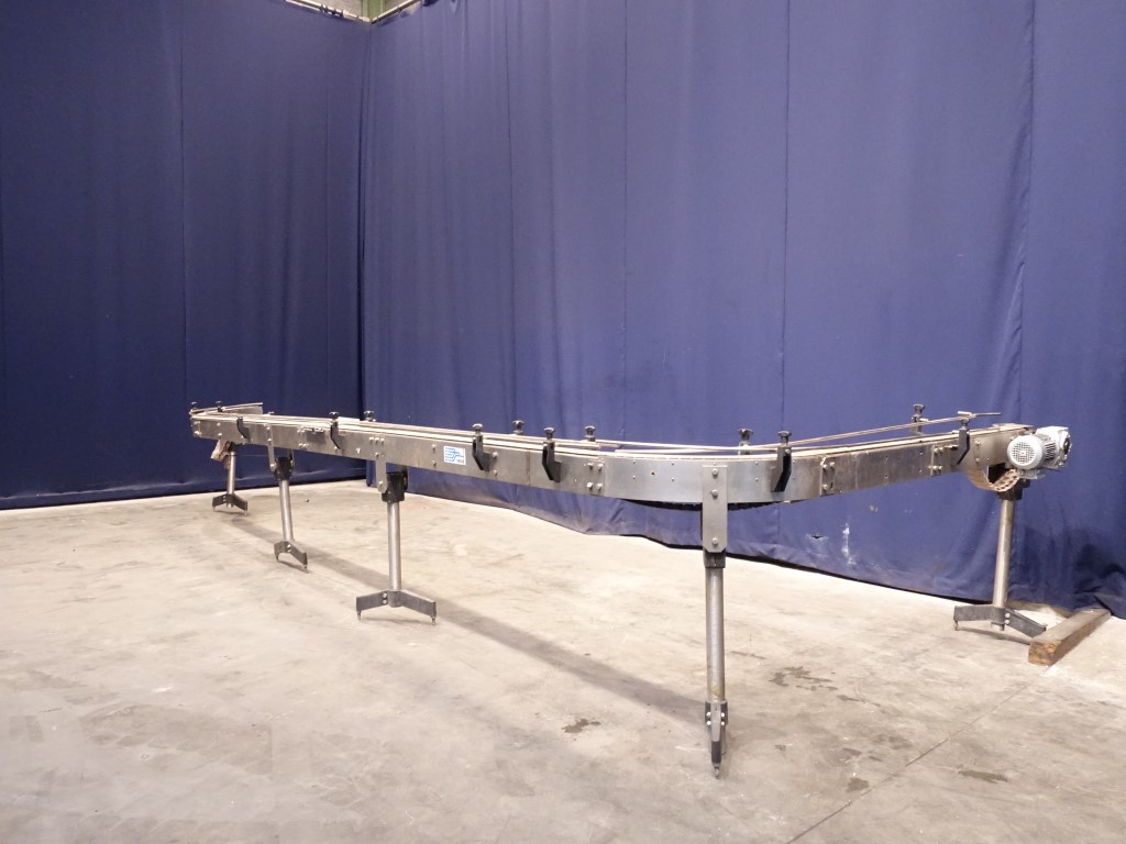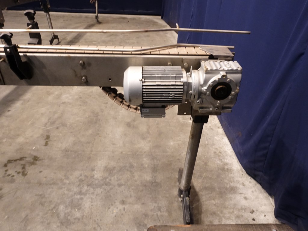 Chain conveyor. Effective Belt lxw: 600 x 8 cm + 2 x 90° corner. Motor: 0,55 kW - 1,76 A - n1: 1360 rpm - n2: 59 rpm. Horizontal. Conveyor is disassembled into 2 parts, to be connected, end roll missing.