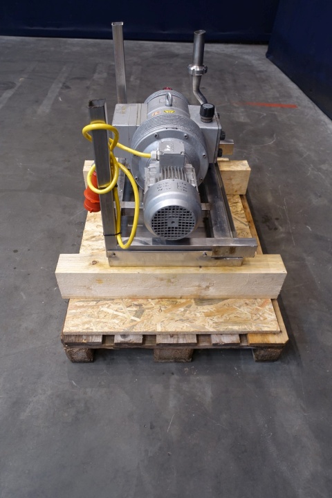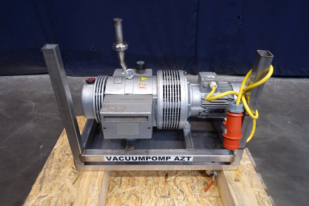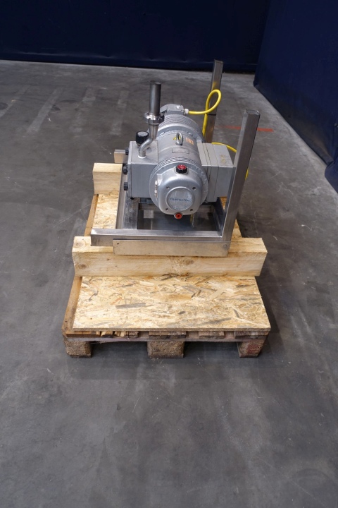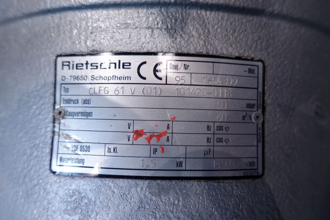 Rietschle rotary vane vacuum pump, type: CLFG 61 V (01) with serial number: 1654309, year of construction: 1995, capacity: 60 m³ per hour. Engine: 1,5 kW - 3,4 A - 1.420 rpm - 50 Hz. Connection: 1x 1,5" Din. Total dimensions: 85x53x65 (lxwxh) cm - weight: 140 kg.