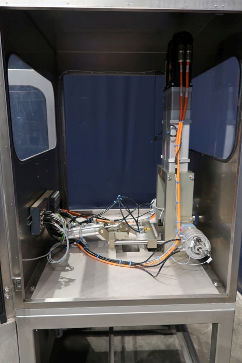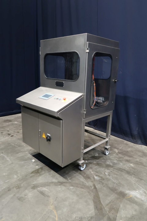 Unused experimental machine for forming and pressing Edammer cheese to small cheese balls (in combination with vacuum filler, which is excluded) by mold principle. including servo motors, siemens touch screen panel. Capacity: 40 balls per minute. Power 6 kW - 400 V - 50 Hz. Including press, frame and outfeed slide. Complete manual and electric scheme available in dutch language. Total dimensions: 108 x 130 x 198 cm.
