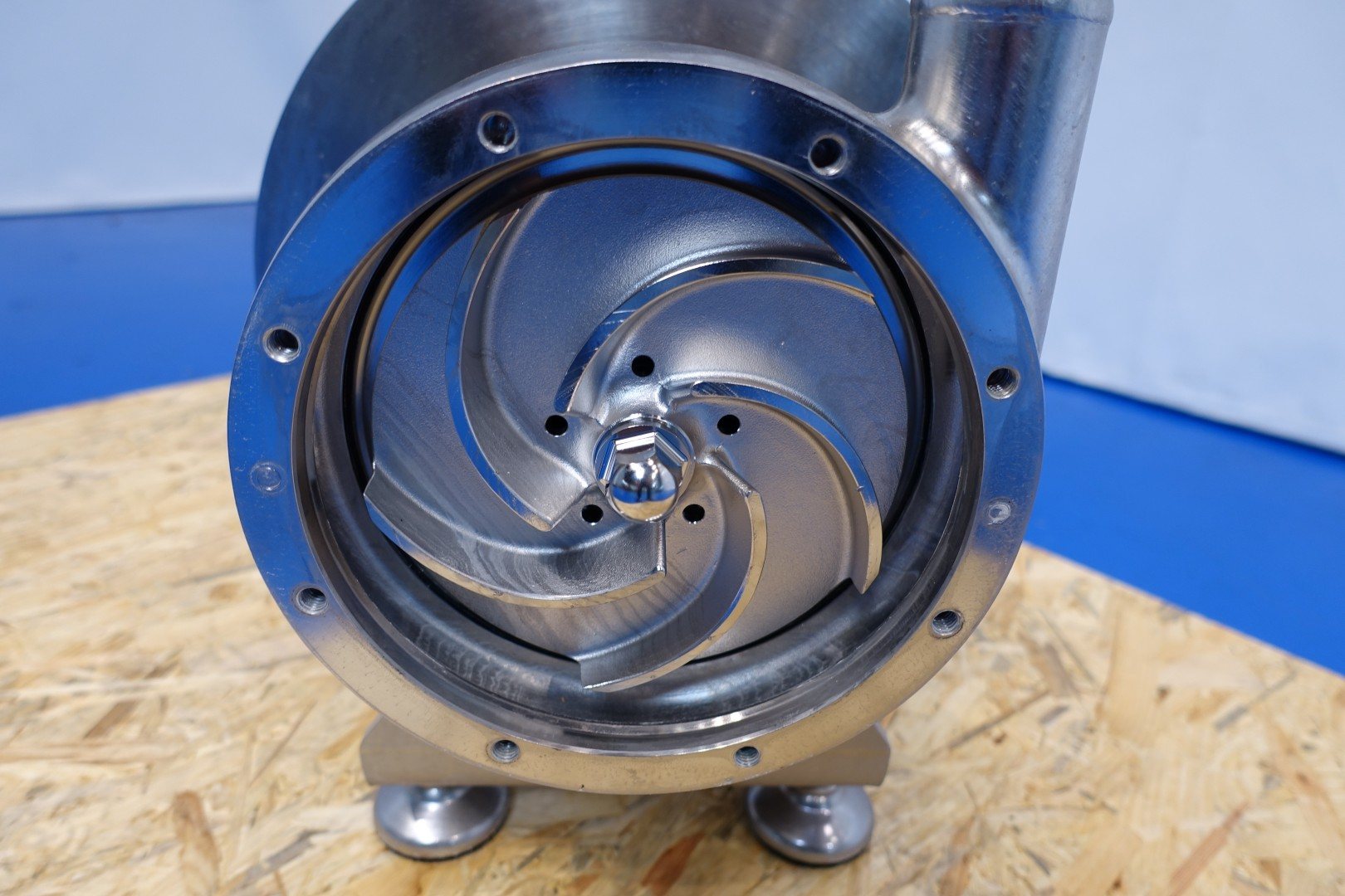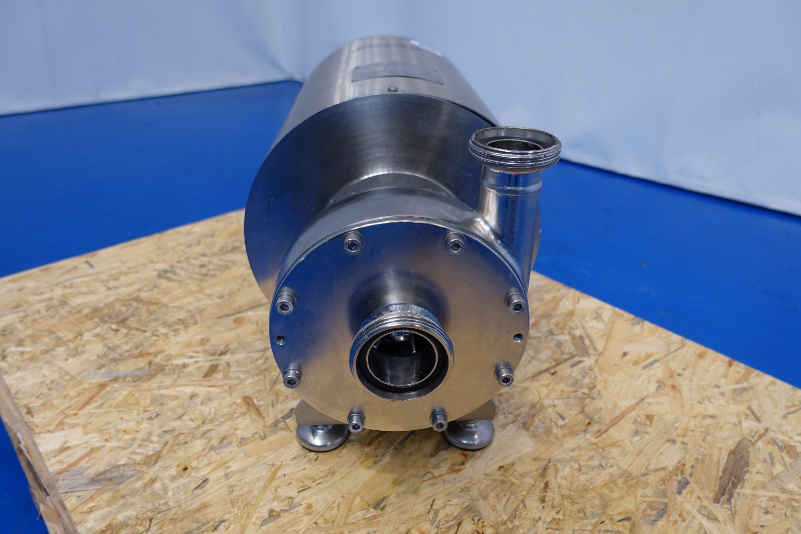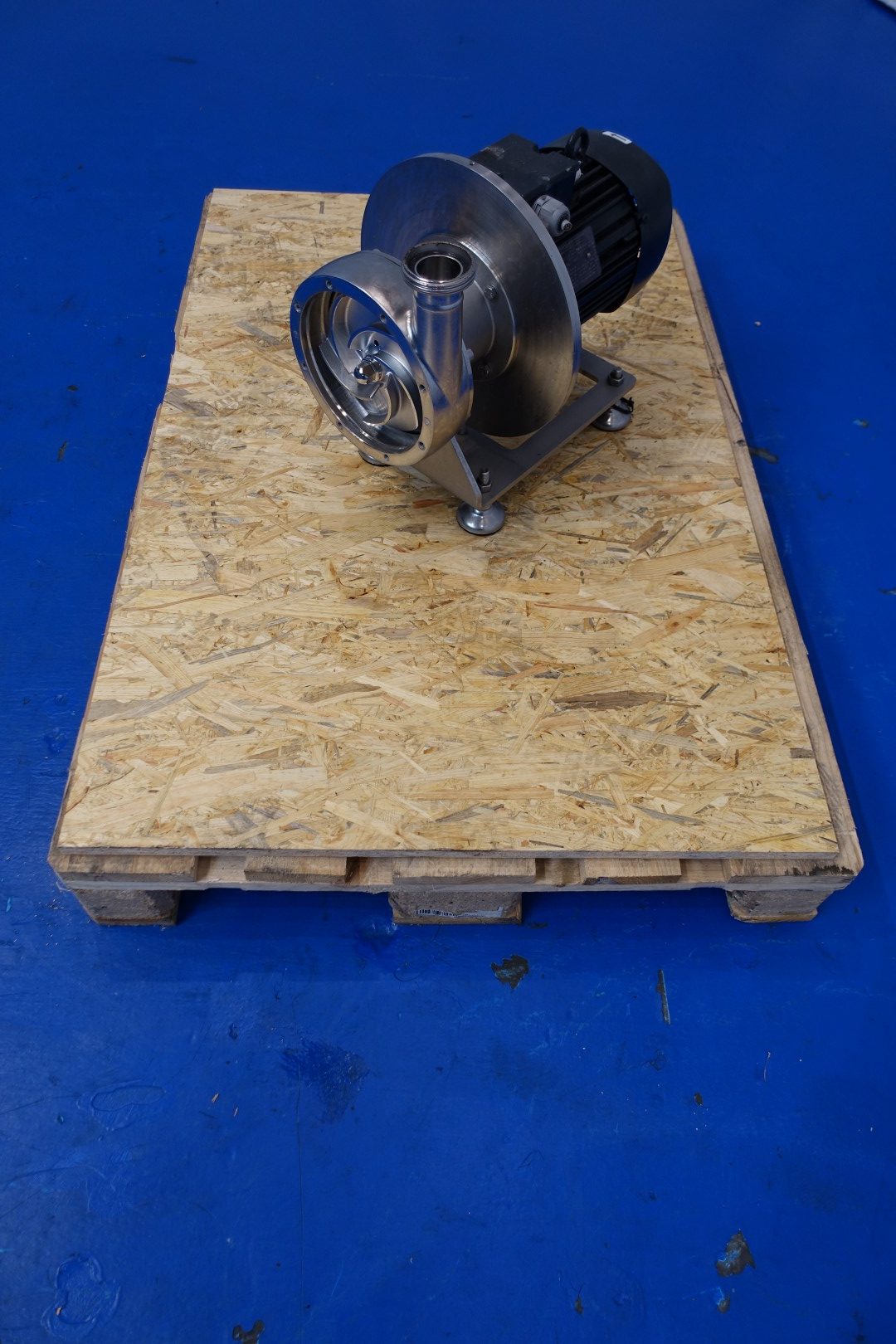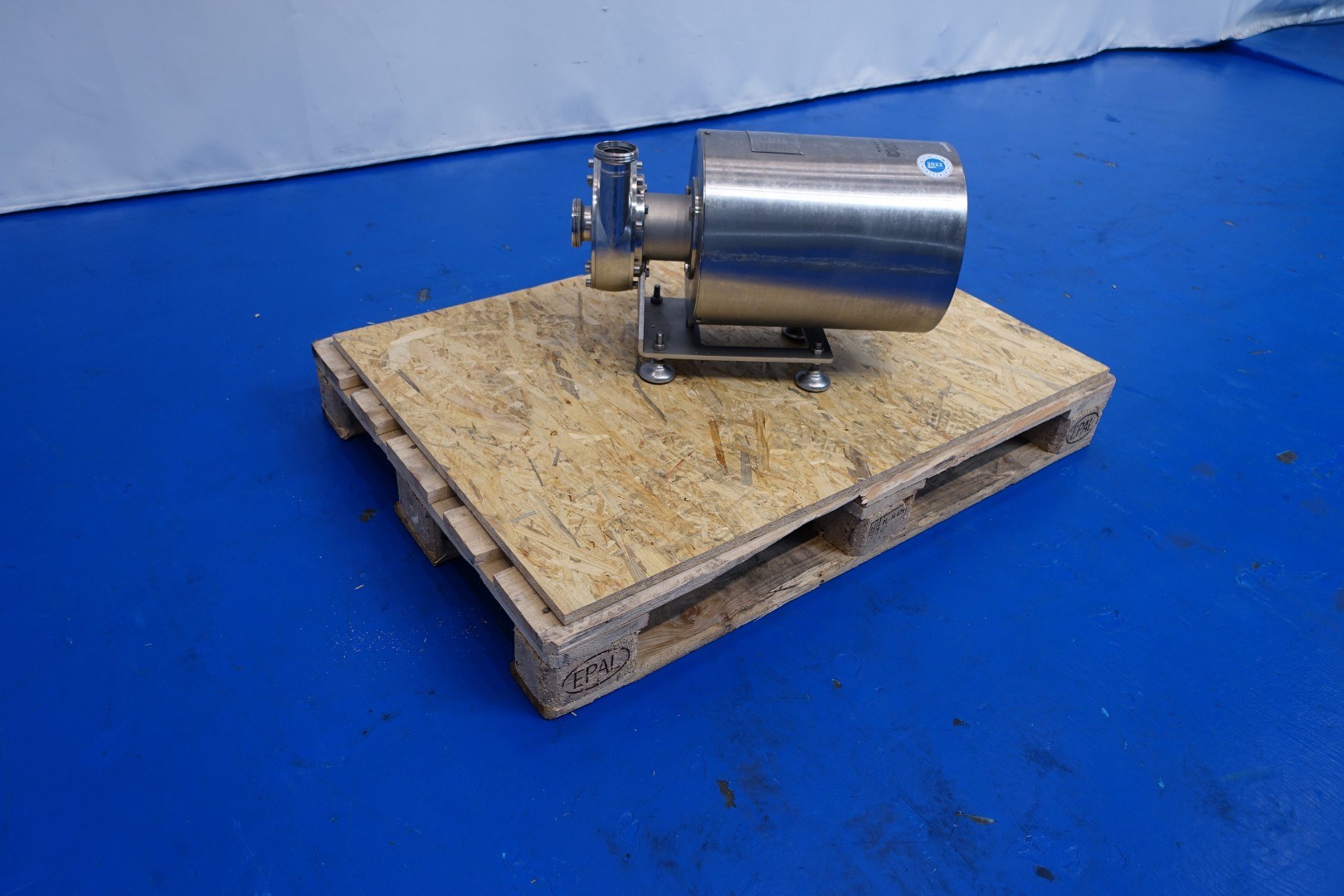 Sanitary centrifugal pump. Current motor: 2,2 kW - 4,25 A - 2.880 rpm. Pressure 35m = ± 3,5bar Impellor diameter: 150 mm. Connections: (In) DN50 Din / (Out) DN40 Din. Total dimensions: 59x30x38 (lxwxh) cm - weight: 86 kg.