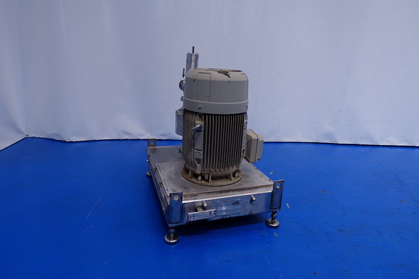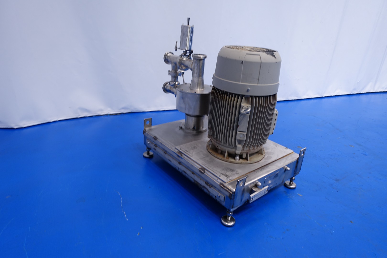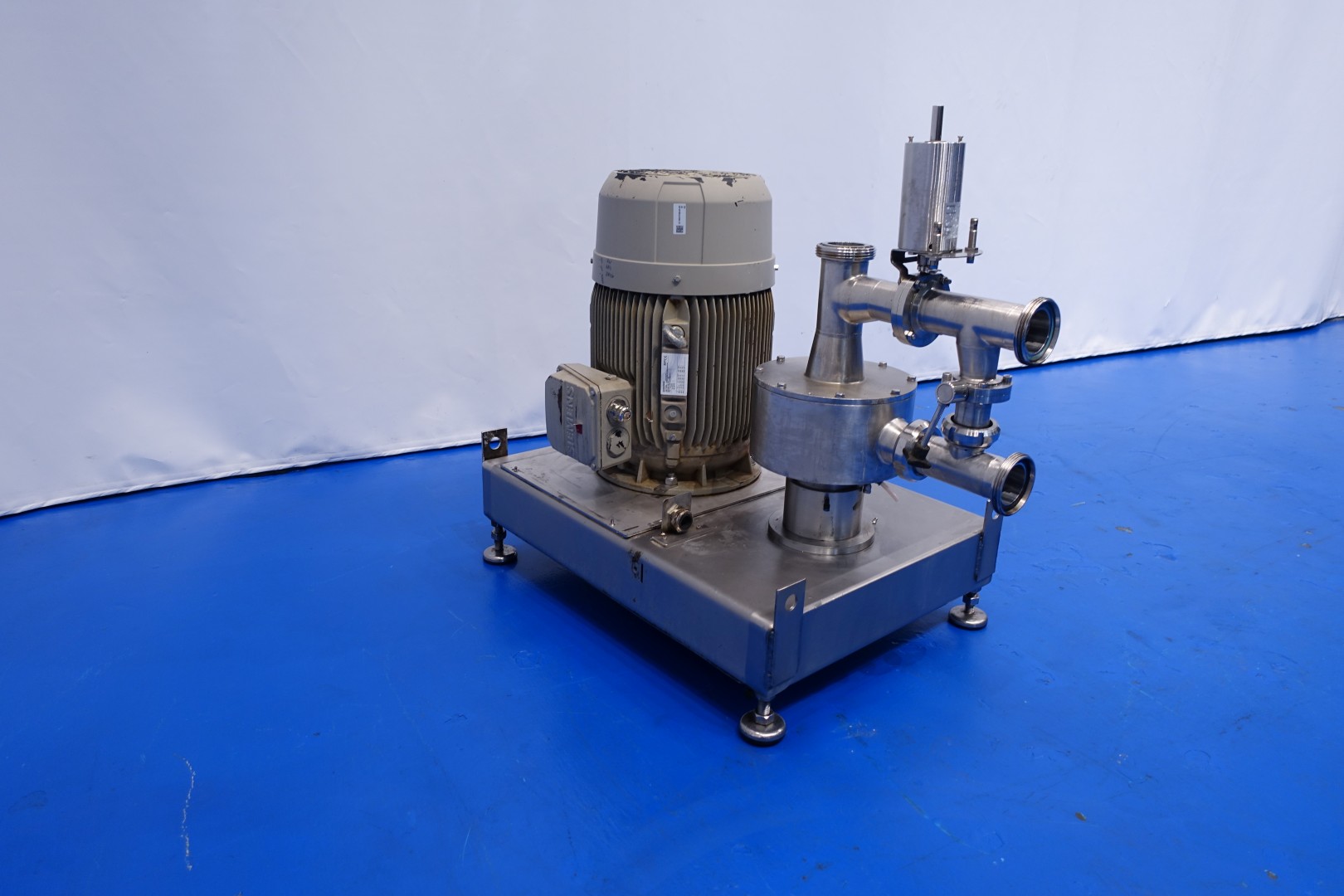 Inline high shear dissolver - dispergator mixer. Impellor diameter: 198 mm. Cilinder diameter: 200 mm, screen hole diameter 4 mm (height cilinder 78 mm). With manual recirculation bypass butterfly valve. Motor: 22,0 kW - 400 V - 38,5 A - 50 Hz - 2.950 rpm. Shaft speed: 2800 rpm. Flushed seal. Connections: 1x 3" SMS and 2x 2,5" Din. Total dimensions: 110x63x90 (lxwxh) cm - weight: 355 kg.