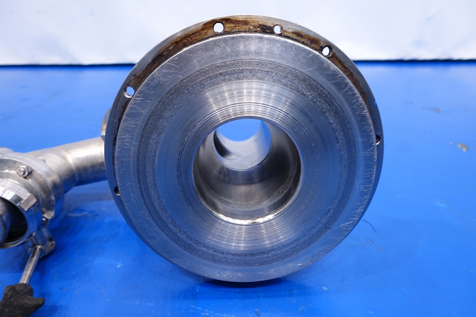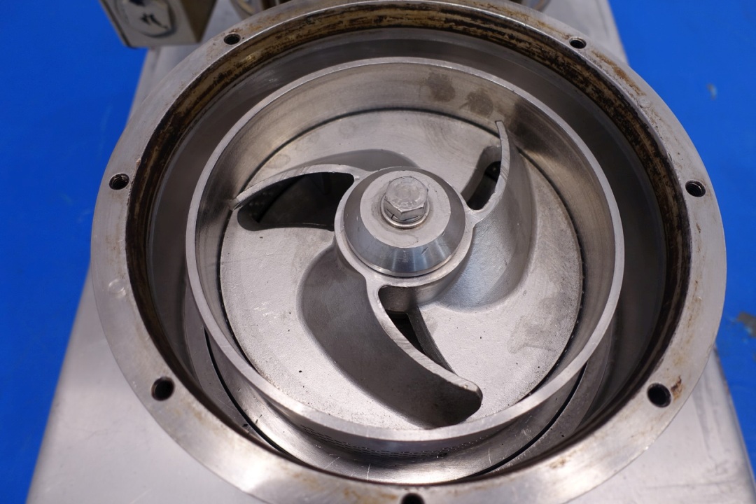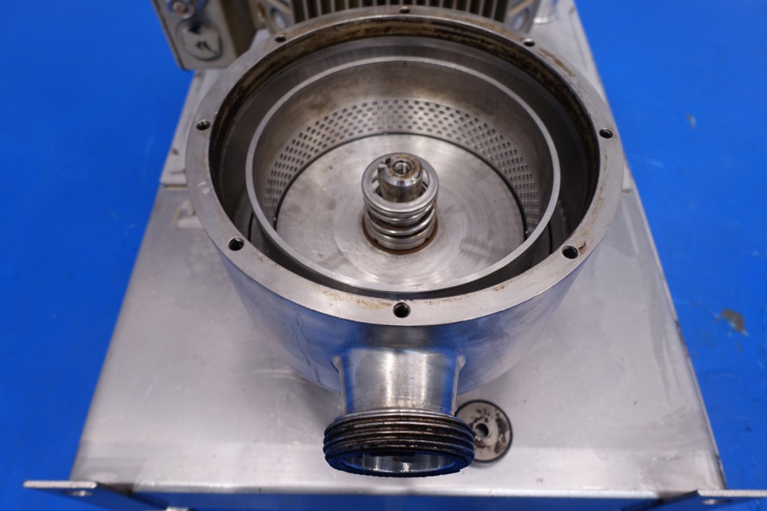Inline high shear dissolver - dispergator mixer. Impellor diameter: 198 mm. Cilinder diameter: 200 mm, screen hole diameter 4 mm (height cilinder 78 mm). With manual recirculation bypass butterfly valve. Motor: 22,0 kW - 400 V - 38,5 A - 50 Hz - 2.950 rpm. Shaft speed: 2800 rpm. Flushed seal. Connections: 1x 3" SMS and 2x 2,5" Din. Total dimensions: 110x63x90 (lxwxh) cm - weight: 355 kg.