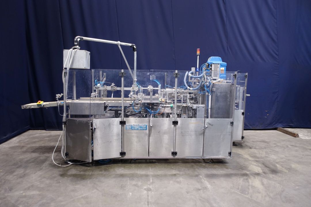 Fully automatic packer, to pack butter packs in an Carton type: American folding box. Operates fully automatically and all principal movements are mechanically driven. Used for 250gr bricks of foil 100 x 75 x 35 mm packed / and wrapped. Maximum box dimensions 330 x 220 x 230 cm. Current dimensions of the box/plano: 300 x 200 mm. Layout of the box 4x2x2 layers = 16 packs of 250 gram per carton = 4kg / carton. Capacity = max. 15 cartons per min. = max. 240 packages per min on input, 2 lanes. Nordson Problue 7 hotmelt glue unit with 3 glue points. Controls Siemens S5 PLC. Has been running together with Benhil 8362 foil packing and wrapping machine (STN15200). Total machine dimensions: 440 x 185 x 220 cm.
