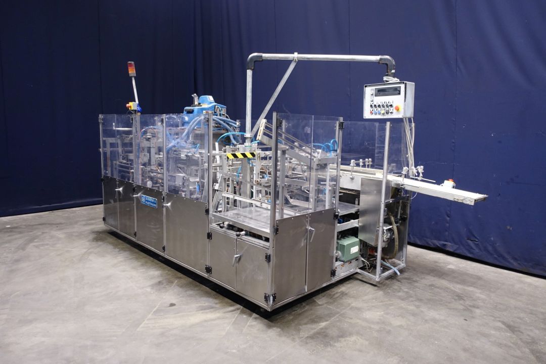 Fully automatic packer, to pack butter packs in an Carton type: American folding box. Operates fully automatically and all principal movements are mechanically driven. Used for 250gr bricks of foil 100 x 75 x 35 mm packed / and wrapped. Maximum box dimensions 330 x 220 x 230 cm. Current dimensions of the box/plano: 300 x 200 mm. Layout of the box 4x2x2 layers = 16 packs of 250 gram per carton = 4kg / carton. Capacity = max. 15 cartons per min. = max. 240 packages per min on input, 2 lanes. Nordson Problue 7 hotmelt glue unit with 3 glue points. Controls Siemens S5 PLC. Has been running together with Benhil 8362 foil packing and wrapping machine (STN15200). Total machine dimensions: 440 x 185 x 220 cm.