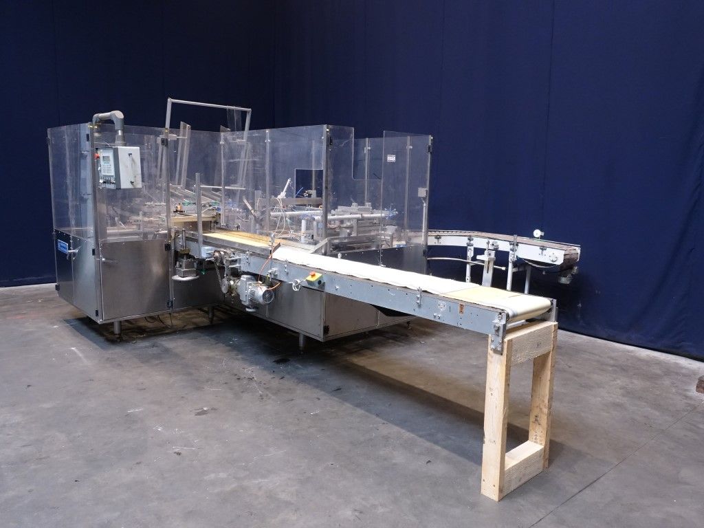 Fully automatic wrap around, stacking and packaging machine for sheets of puff pastry in a carton. 5x 2kg sheets of 20mm height in a 10kg carton box. Suitable as packer behind a Bock BPM filler. Total dimensions: 640 x 350 x 240 cm.