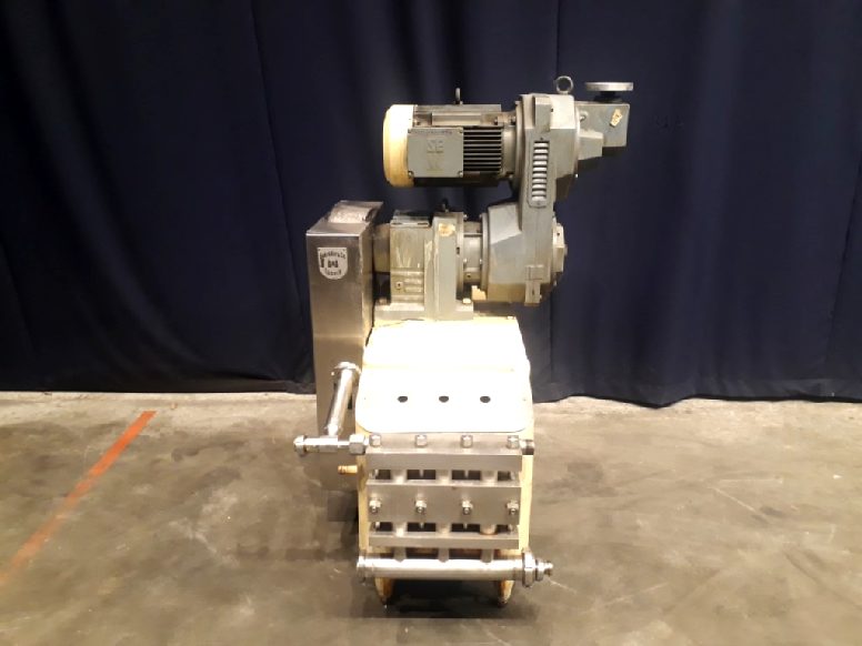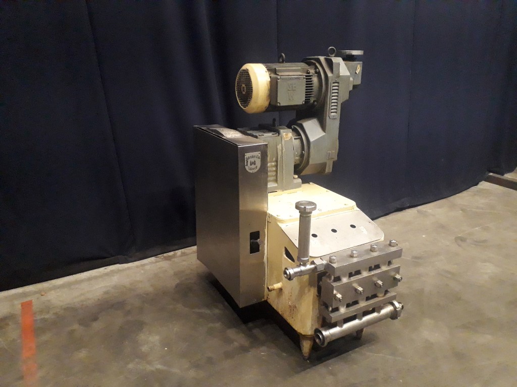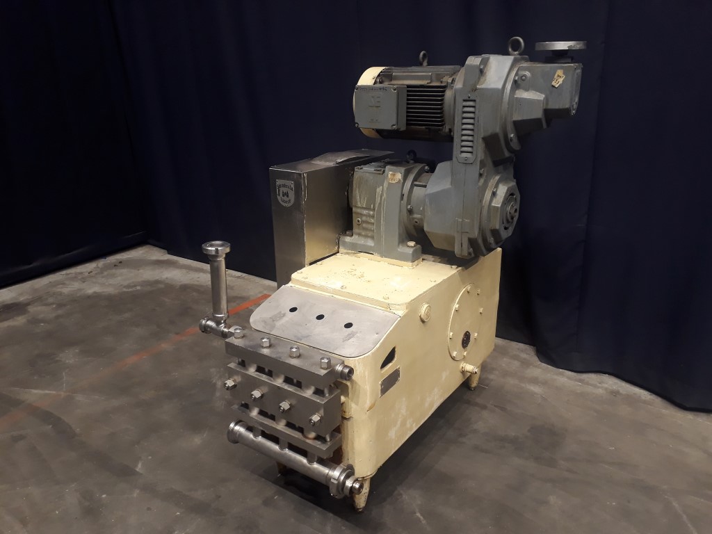 High pressure pump used for margarine. The conveying pump is a 3 piston pump with 3 suction and pressure valves. It conveys the margarine emulsion coming from the premix / buffer vessel at a pressure of 10 - 50 bar overpressure (table margarine) or 30 - 70 bar overpressure (pastry margarine) into and through the cooling cylinders of the crystalliser. Piston diameter: 40 mm and stroke: 105 mm. Motor: 11 kW. Variable speed 81 - 492 rpm with mechanical variator wich results in 640 - 3.893 kg/h. Complete with over pressure valve. Connections: 1,5''/1,5'', DIN. Documentation available. Including set of spare parts. Total dimensions: 110 x 140 x 160 cm.