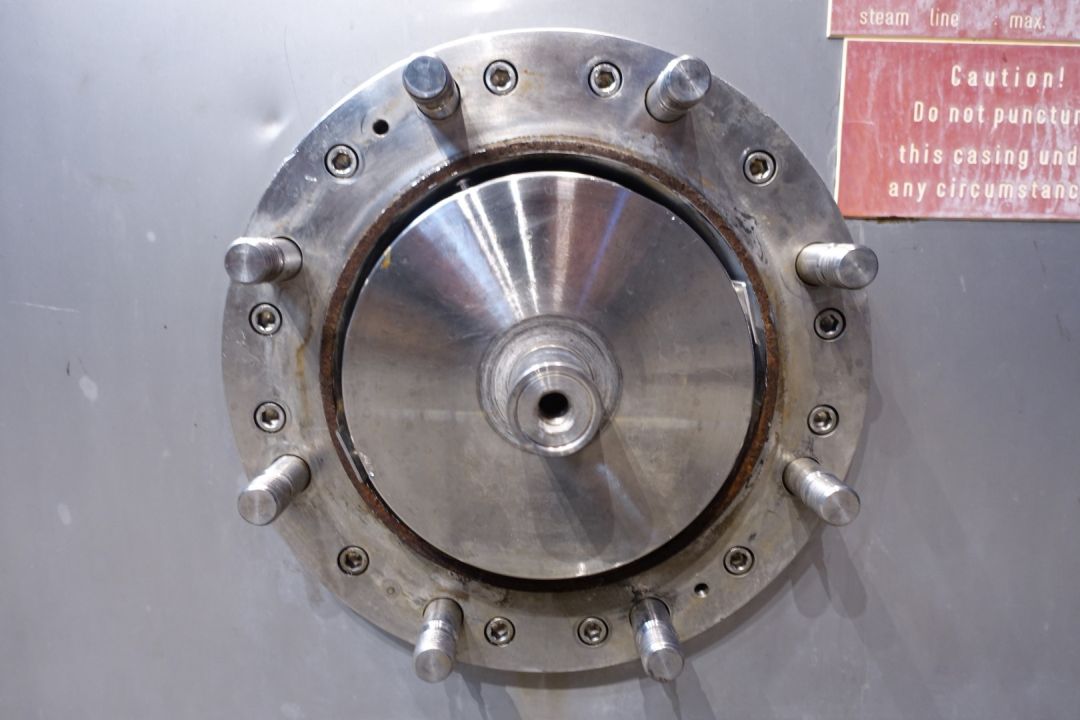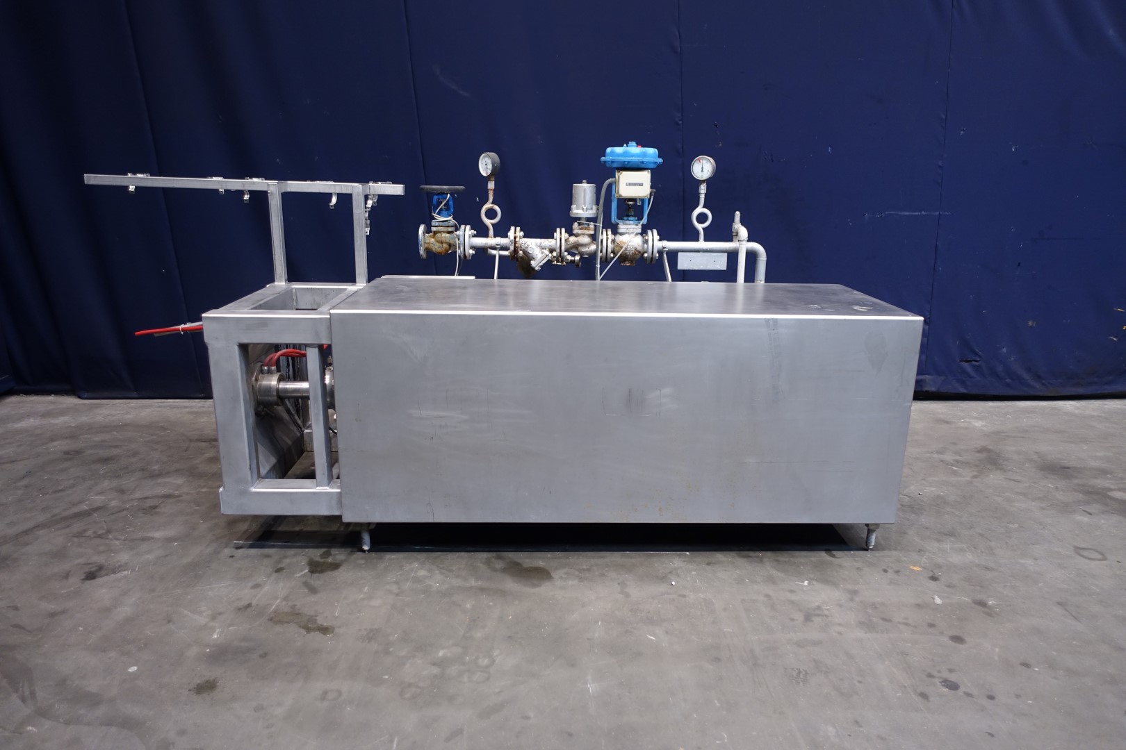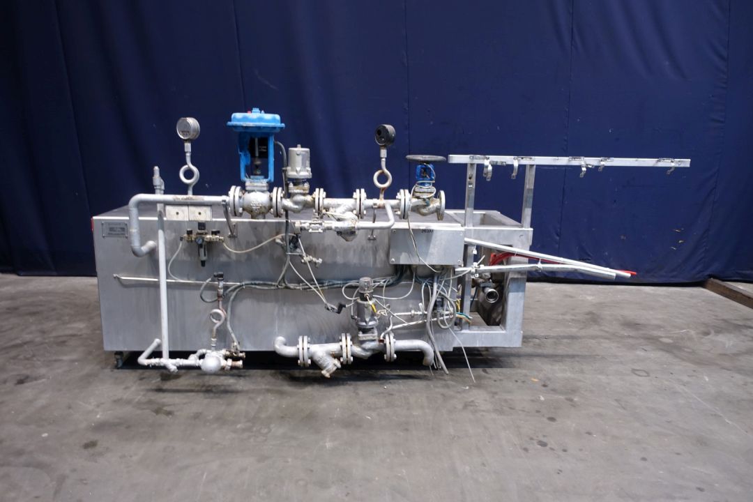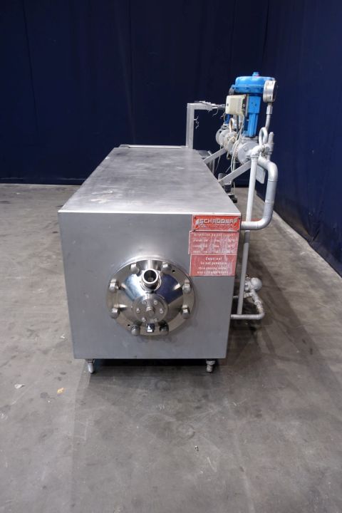 Scraped surface heat exchanger heater for margarine/emulsion. product pressure upto 50bar. pressure in jacket: up to 9 bar. 1 Product cylinder Tube: Ø 250 mm and length: 200 cm. Rotor Ø 230 mm, spline 10mm, 4 Rows with knives on rotor. With steam system. Heating surface per tube: 1,57 m2. Connections In DN50 Din and Out DN50 Din. including: manual valve, steamvalve, stop valve, steamfilter, condensate trap. Excluded motor, controls and documentation. Total dimensions: 340 x 120 x 150 cm.