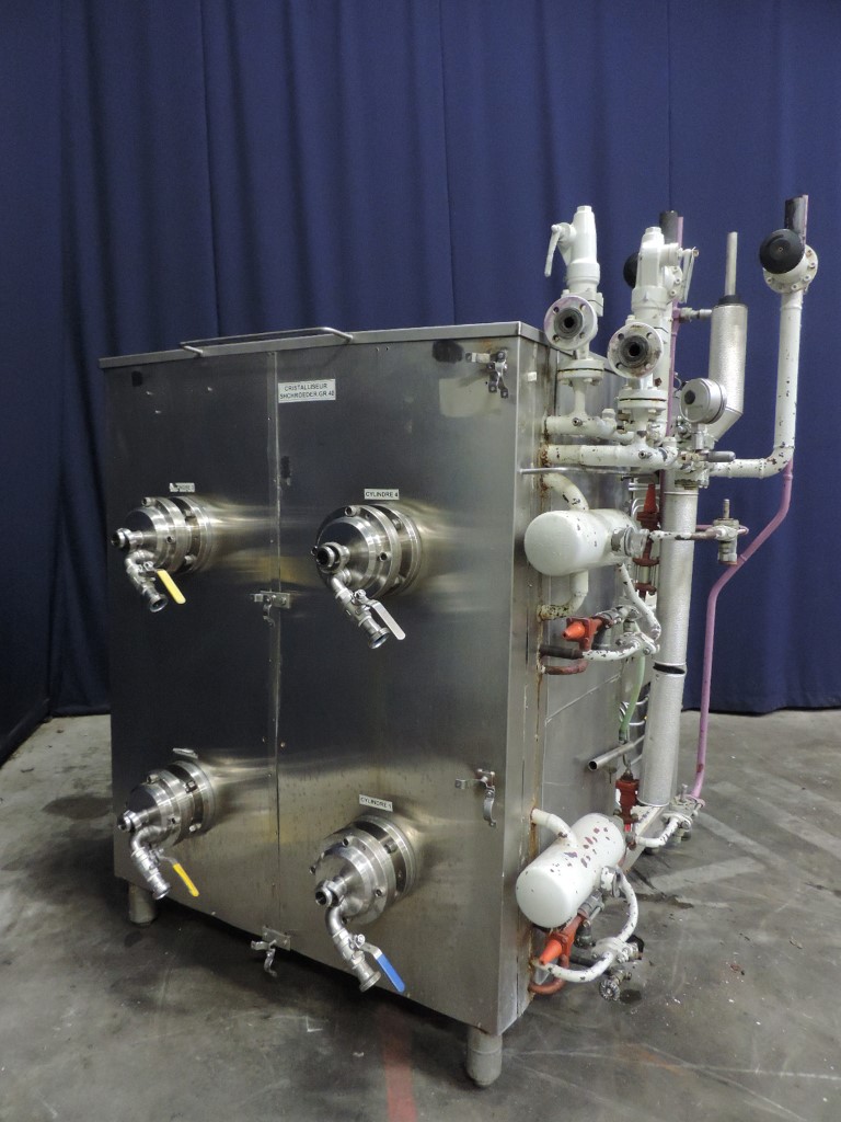 Crystalliser. Scraped surface heat exchanger for Margarine. Product pressure: 20 bar. 4x Product cylinders. 4x Motors, 5,5 + 5,5 + 7,5 + 7,5 kW. Tube: Ø 120 mm, length 820 mm. Cooling surface per tube 0,62 m2. Cooling medium: Ammonia, NH3, pressure: 18 bar, -20 / 45 °C. 2 ammoniac systems including Ammoniac control valves. Including 4 spare rotors / axles. Spare parts manual available. Total dimensions: 2,55 x 1,9 x 2,35 mtr.