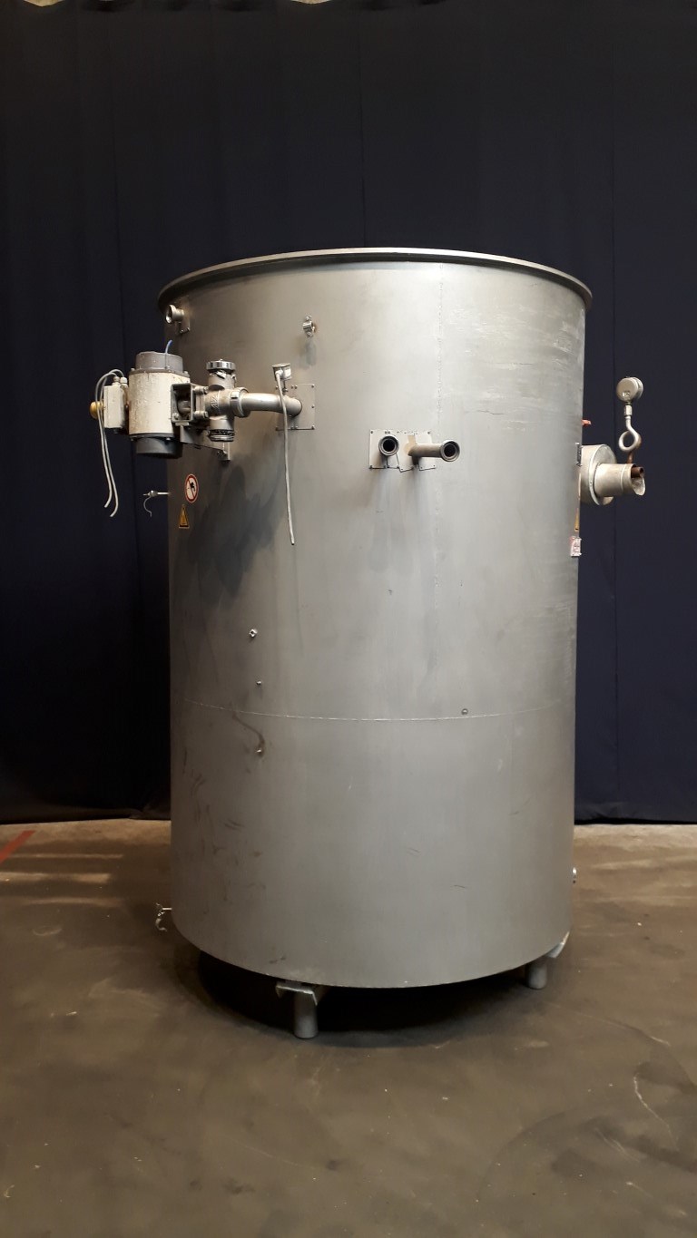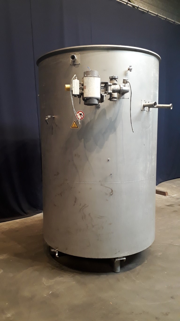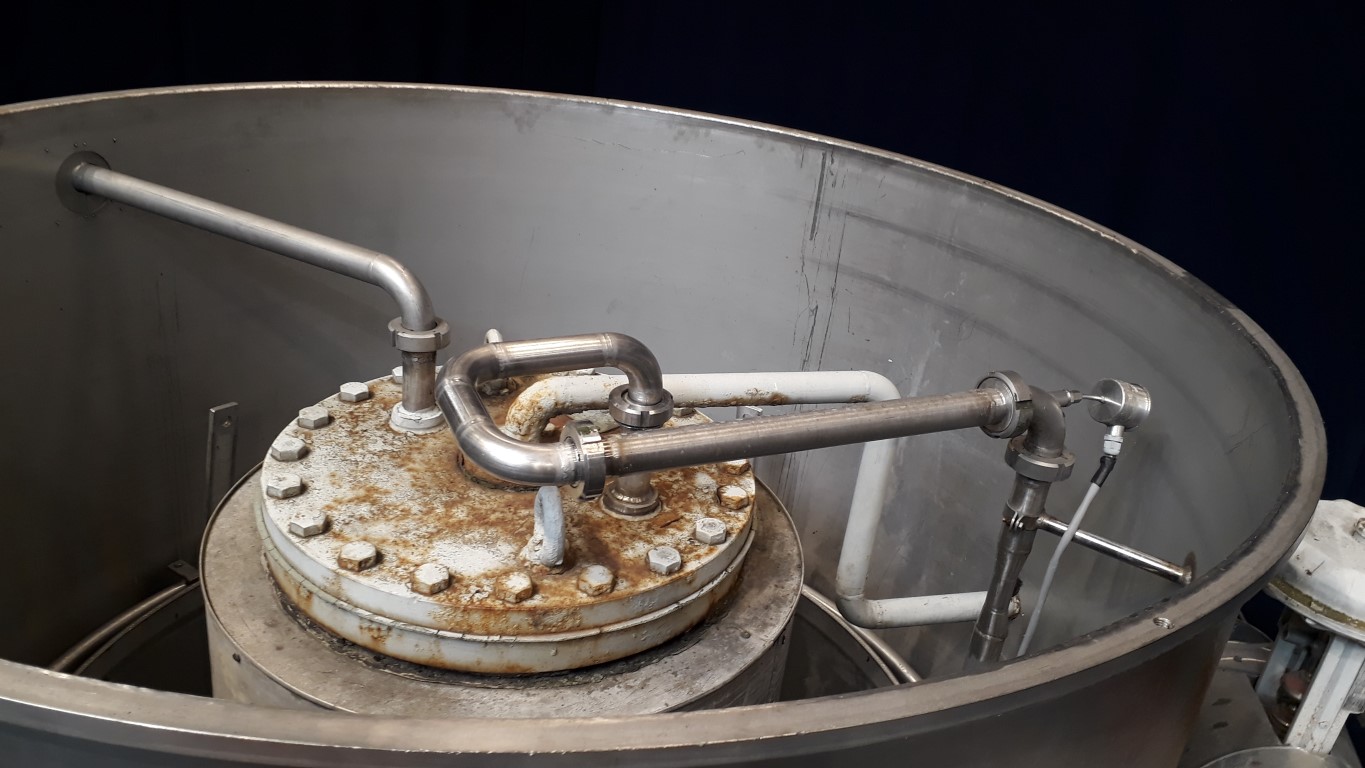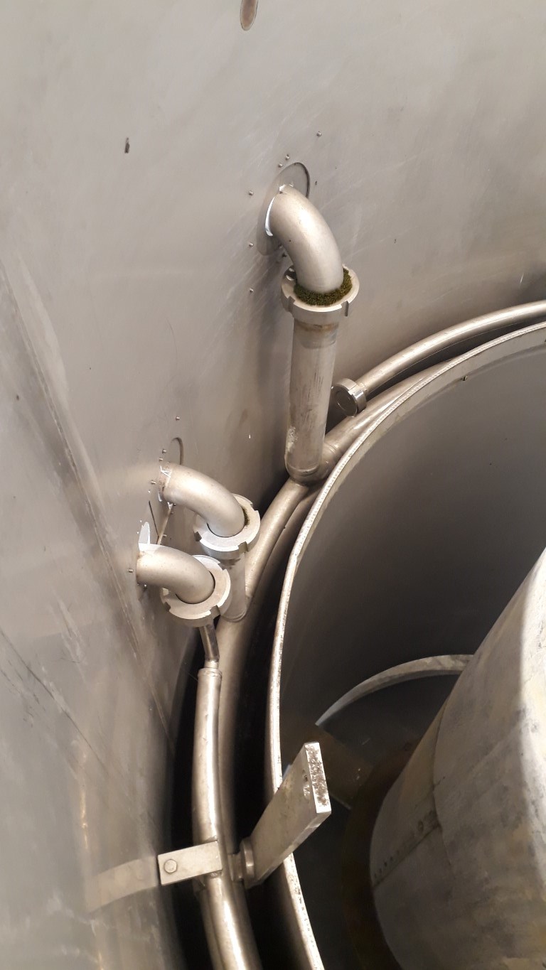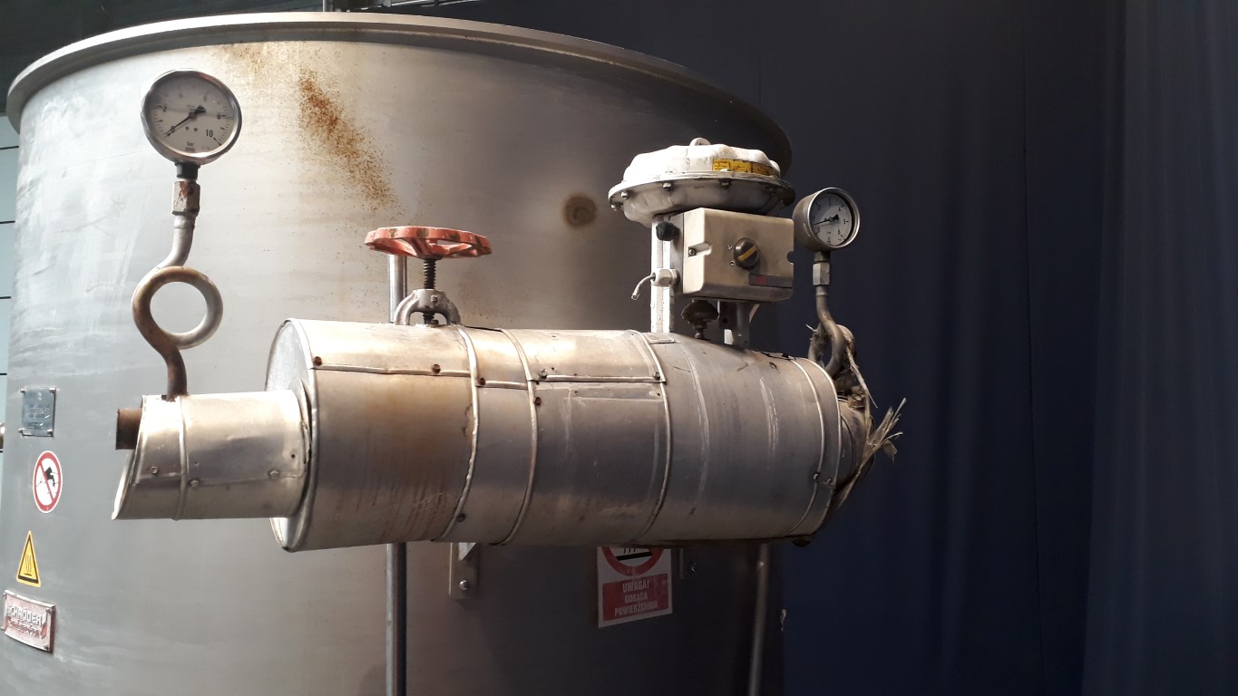 Tubular pasteuriser for emulsion for margarine production. Vertical. Spiral. Maximum working pressure: 75 bar. To be placed after the High Pressure Pump for minimum re-contamination. 2 Sections. 1 Section heated by steam in steam chamber (max 13 bar pressure). Cooling by cooling water (inner tube and spray pipe). Thermal cycle approx: 45 - 85 - 45 °C. Total dimensions: 2,4 x 1,9 x 2,7 mtr.