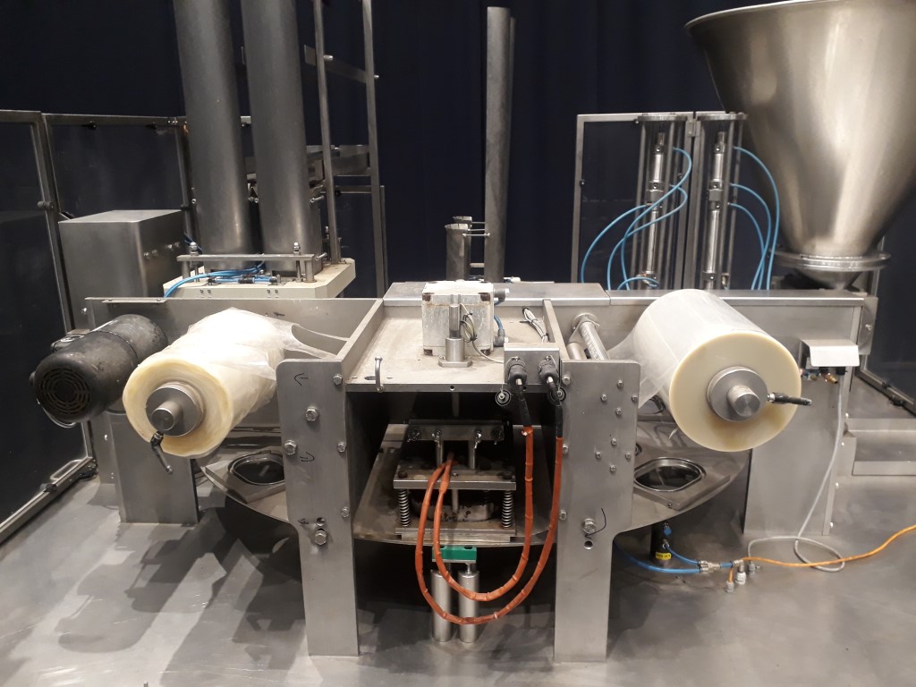 Rotary cup filling and sealing from the reel machine with 2 heads. Stations: Cup destacking, main piston doser (100 - 550 ml) for viscose products (pneumatic) with single jacketed hopper. Sealing from the reel (film width 330 mm, no preformed seals). Heat sealing and snap cap station. No outfeed conveyor. Machine has polycarbonate safety guards. Easy format change. Controls: PLC Siemens S7-300 without operation panel. Electric scheme available.