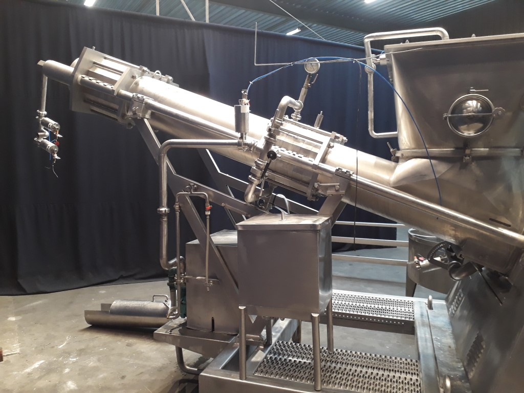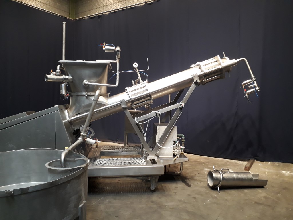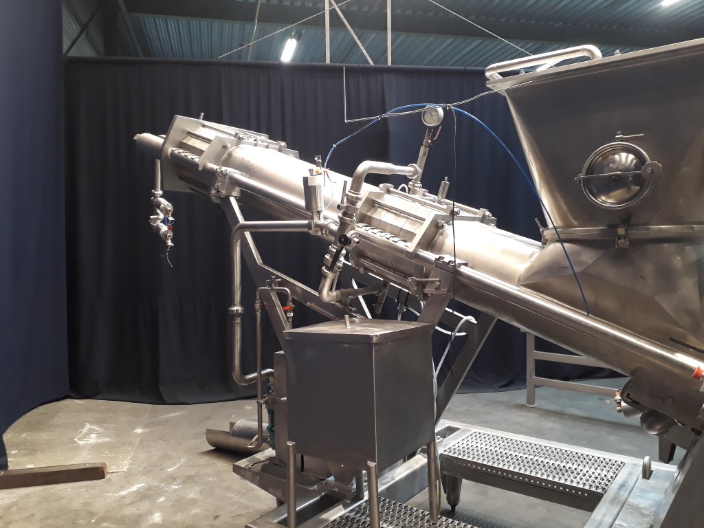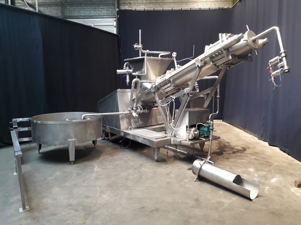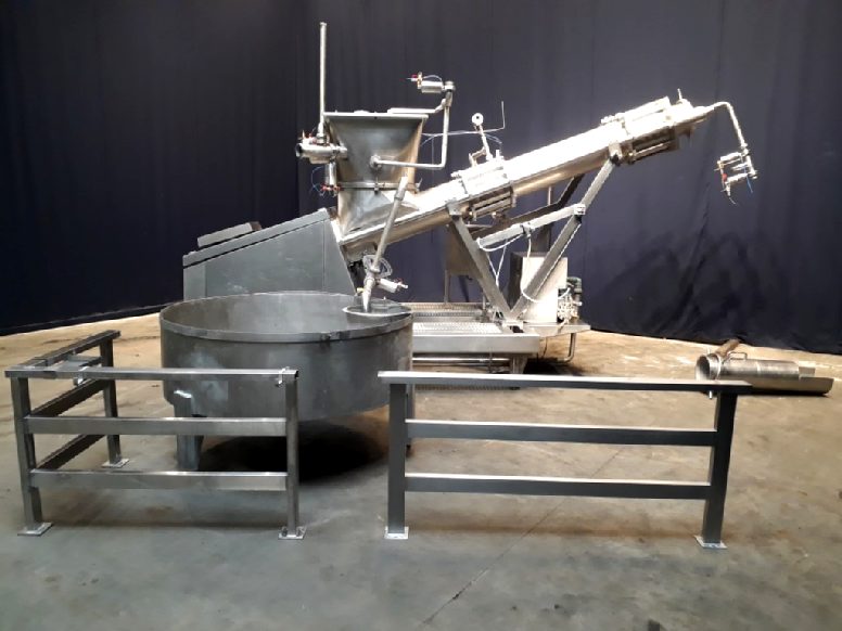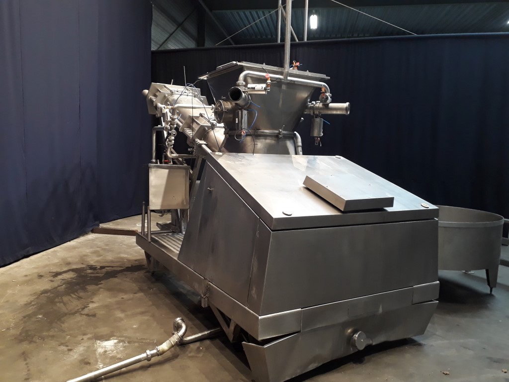 Butter mixing and kneading machine with 2 sections. Section 1: for vacuum, section 2: for injection of culture or water. Feeding of the machine by a butter reworker. This machine has the possibility of precisely adjusting the moisture content by injection culture or brine water, or blending 2 different butters from 2 different reworkers. Vacuum working to reduce the air content. Useable for working / softening and blending any product with a consistency similar to that of butter. Complete with all piping, framework and round, open return vat.