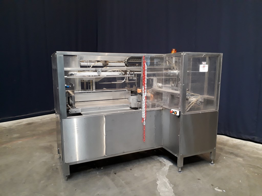 Fully automatic case packer for butter packages in a carton box. Currently set for 250 gram packages of 108 x 63 x 39 mm, pack scheme 5x2x4 = 40 packages of 250 gram in 1 box (10 kg per box). Type of cartons: American folding box. Including infeed and outfeed conveyor. Spare parts manual and electric scheme available. Had been running together with a SIG FD140, STN12176.