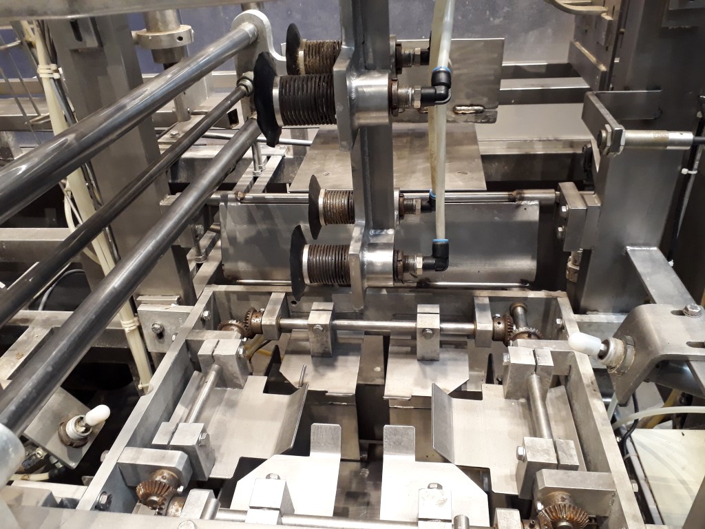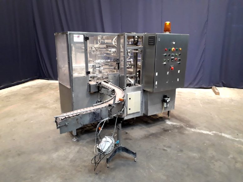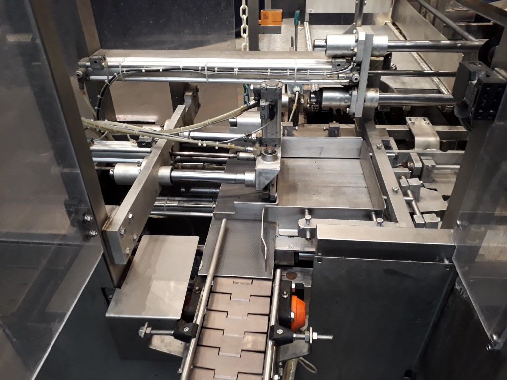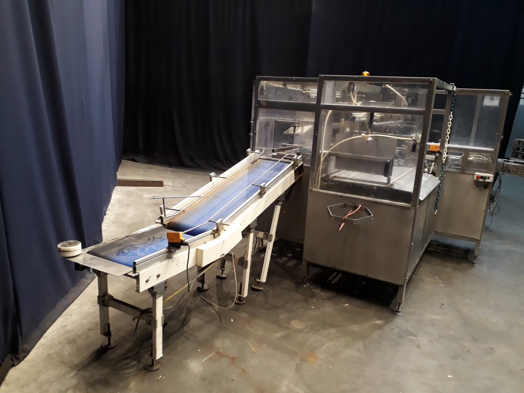 Fully automatic case packer for butter packages in a carton box. Currently set for 250 gram packages of 108 x 63 x 39 mm, pack scheme 5x2x4 = 40 packages of 250 gram in 1 box (10 kg per box). Type of cartons: American folding box. Including infeed and outfeed conveyor.