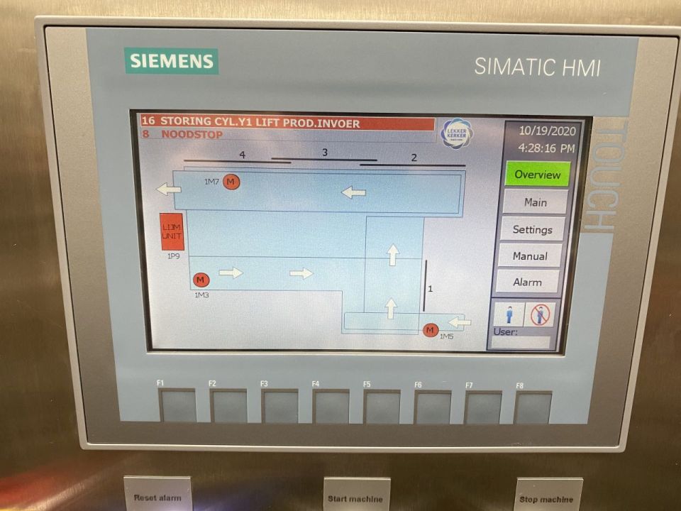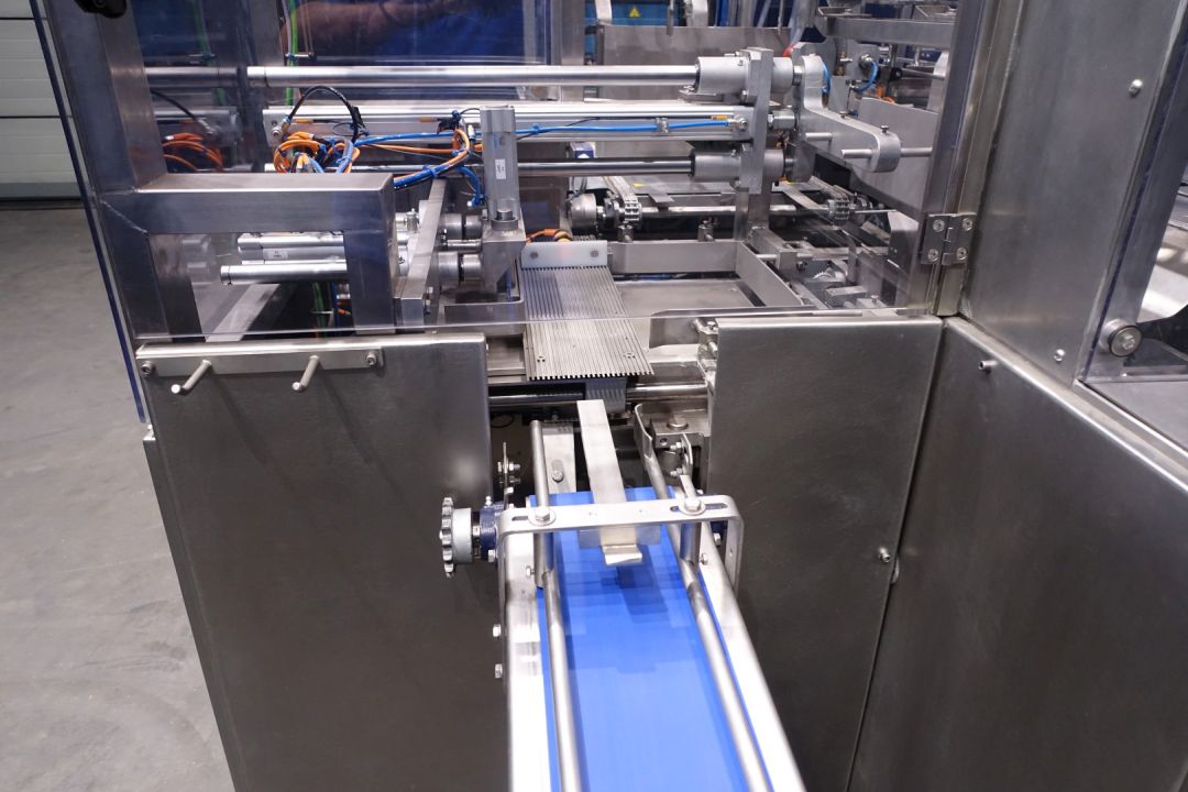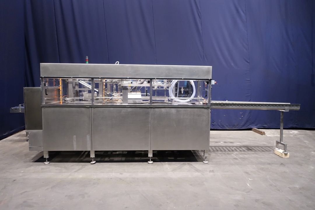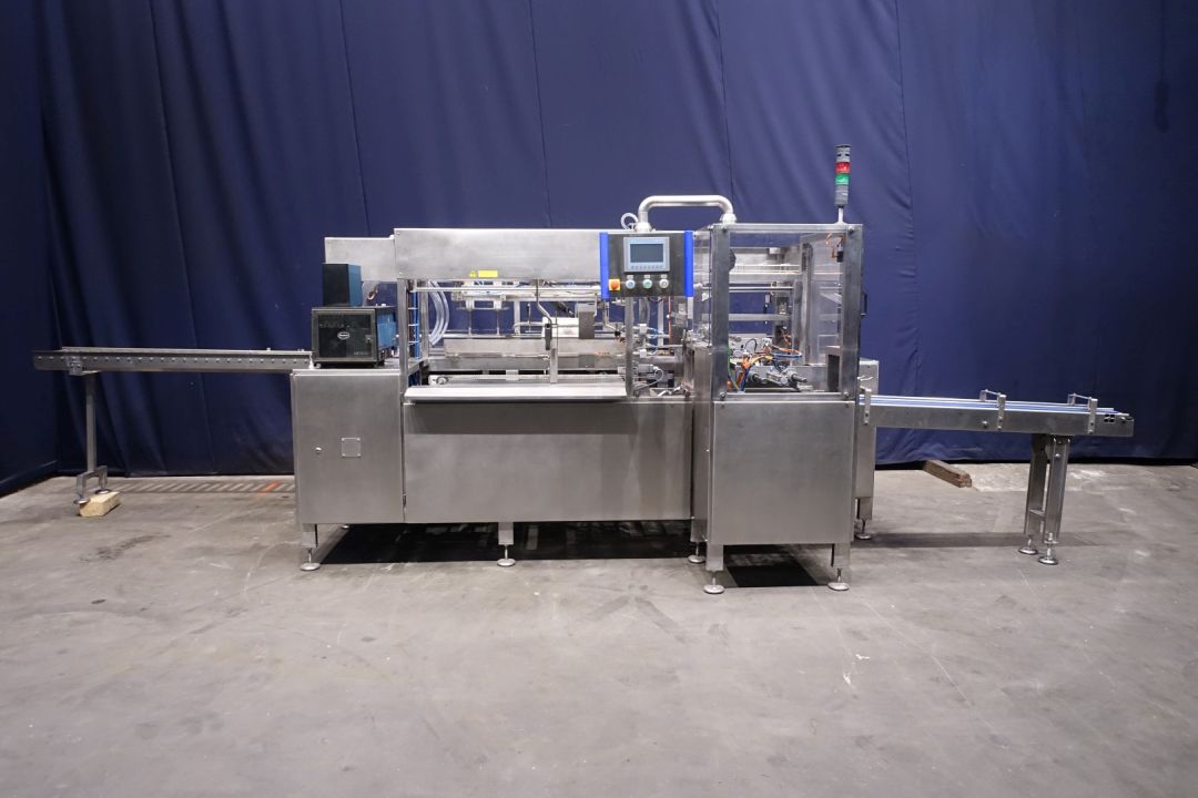 Automatic case packer. Fully reconditioned for butter packages in a carton box. Currently set for 250 gram packages of 100 x 75 x 37 mm, pack scheme 4x2x2 = 16 packages of 250 gram (100x75x35mm) in 1 box (4 kg per box). Type of cartons: American folding box. New control panel with new Siemens S7-1200 PLC and Siemens Simatic HMI, KTP700. Reconditioned Nordson hotmelt unit with glue hoses. Machine frame complete stainless steel. New polycarbonate doors with protection for opening. Including infeed and outfeed rolling conveyor. Instruction manual (Dutch), spare part manual and electric scheme available. Machine with CE declaration of conformity. Machine speed synchronised with a Benhil 8345 or Benhil 8380 model (20-90 packages / minute).