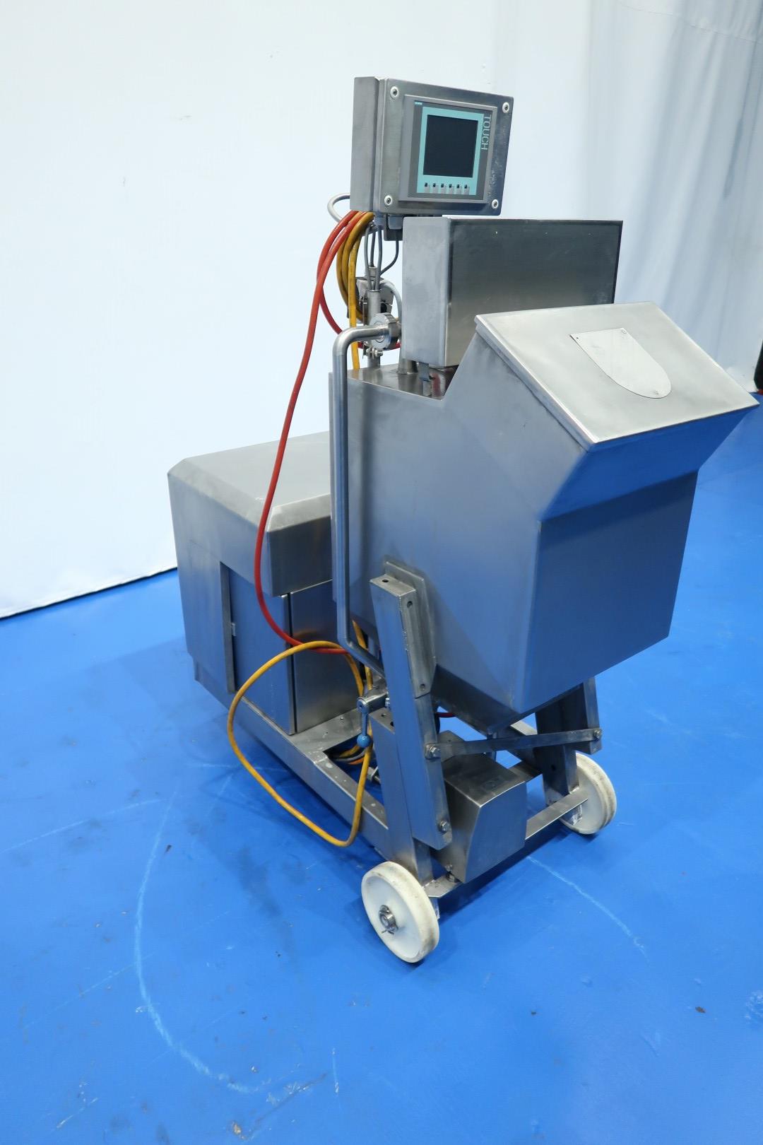 Water or water with dissolved salt dosing set used on a Continous butter Machine CBM to control the humidity. Can be used anywhere where dissolving and little accurate dosing of liquids 0-50ltr is needed. Onmobile SS frame with ss vessel ca. 50 ltr, with propellor agitator. A Dosing pump Make: Sera model: RF 409.2-50e with a capacity of: 0-50 ltr/h, the capacity can be arranged by freq converter on the pump and adjusting the stroke by hand. The volume measured by a Flowmeter E&H Promag H-53 and displayed on the hmi screen. Adjustement by +/- buttons, There is a Centrifugal pump for circutlation and cip return Make: Alfa Laval GM-A/75. Controls by Siemens PLC S7-1200 CPU and with 2x frequency convertor and operation touchscreen. Dimensions: 122x120x159 (lxwxh) cm - weight: 174 kg.