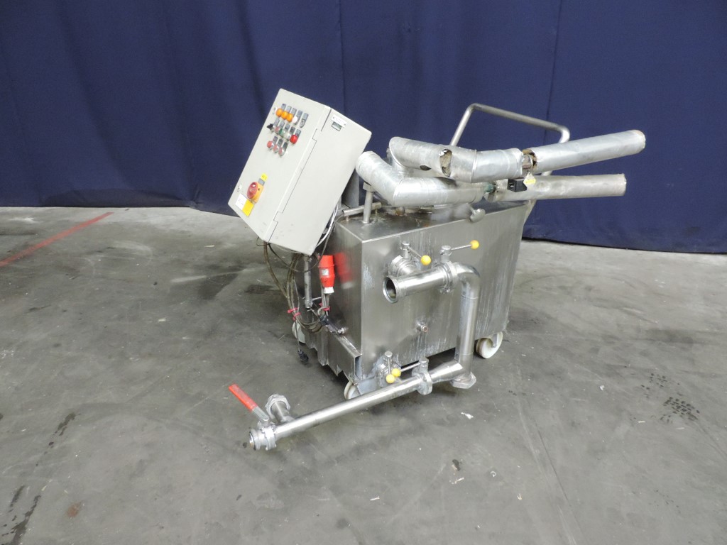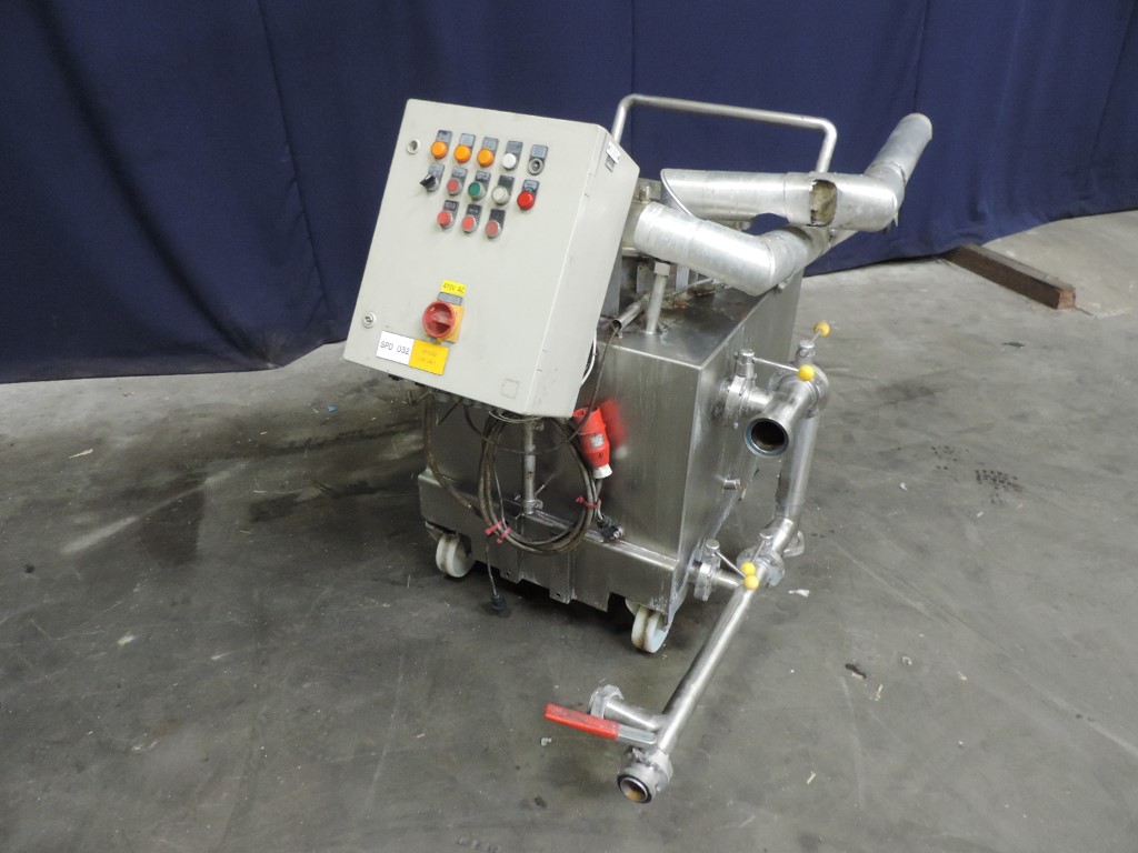 Small mobile CIP set. Horizontal tank. Product Outlet 2'' RJT. With manual butterfly, connections for: high and low level, breather, manhole in top round diameter 400 mm. Inner dimensions of tank lxwxh: 65 x 75 x 58 cm. Outer dimensions lxwxh: 100 x 170 x 130 mm.