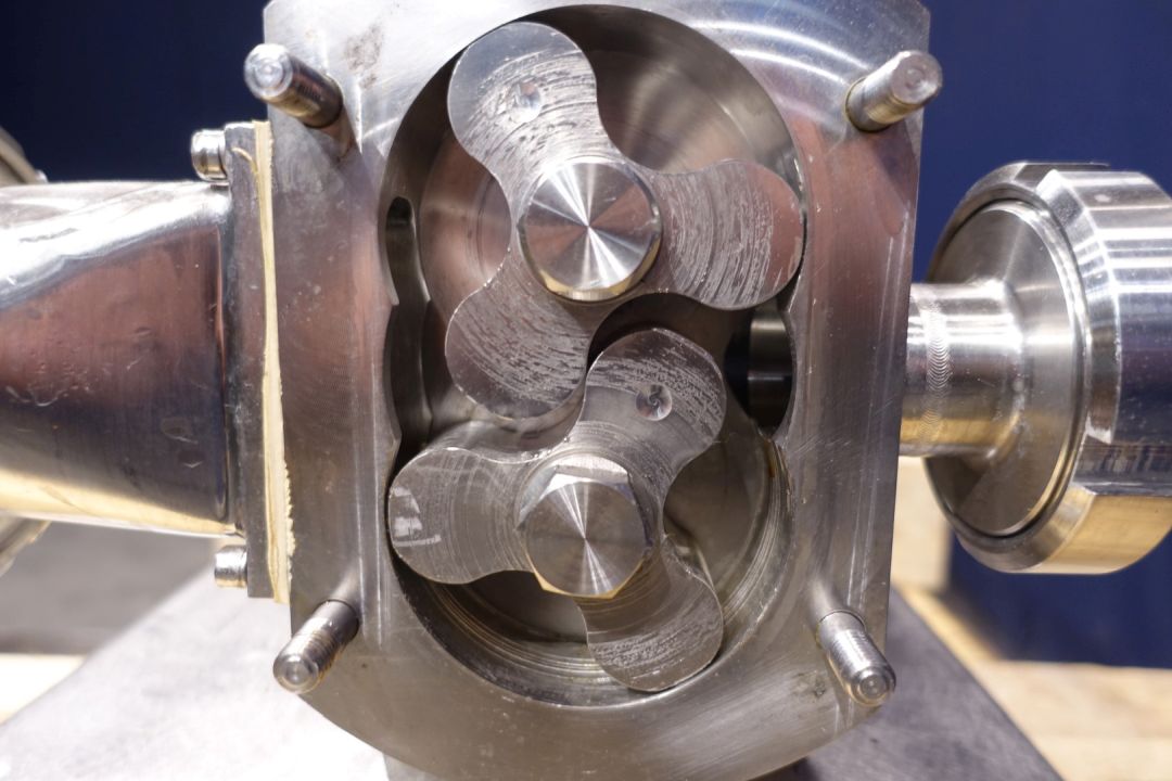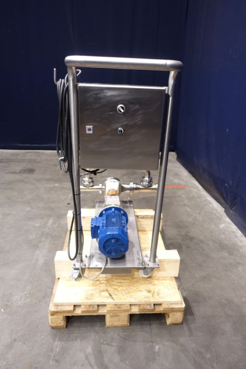 Lobbe pump with tri stainless steel lobbes. Diameter lobbes: 80 mm. Current drive work: motor: 1,5 kW - 3,51 A - n1: 1.440 rpm - i= 7,2 - n2: 158 rpm. Variable speed by Mitsubishi D700-SC frequency converter in panel direct on frame. Stainless steel cover over electric motor. By-pass pipe for cleaning with two manual butterfly valves. Mounted on mobile SS frame with handle bar. Connections: (in) 3" Din / (out) 2,5" DIN. Elsto transmission type C322P P90. Weigth 170 kg.