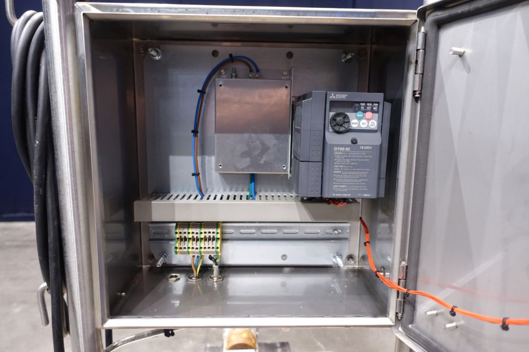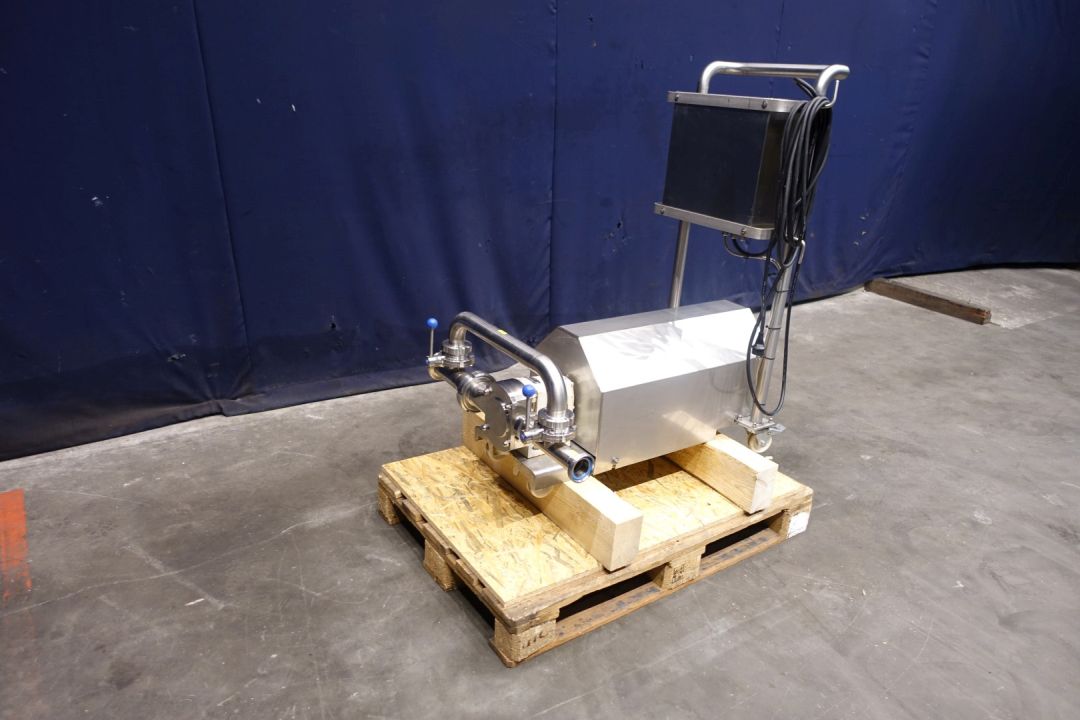 Lobbe pump with tri stainless steel lobbes. Diameter lobbes: 80 mm. Current drive work: motor: 1,5 kW - 3,51 A - n1: 1.440 rpm - i= 7,2 - n2: 158 rpm. Variable speed by Mitsubishi D700-SC frequency converter in panel direct on frame. Stainless steel cover over electric motor. By-pass pipe for cleaning with two manual butterfly valves. Mounted on mobile SS frame with handle bar. Connections: (in) 3" Din / (out) 2,5" DIN. Elsto transmission type C322P P90. Weigth 170 kg.