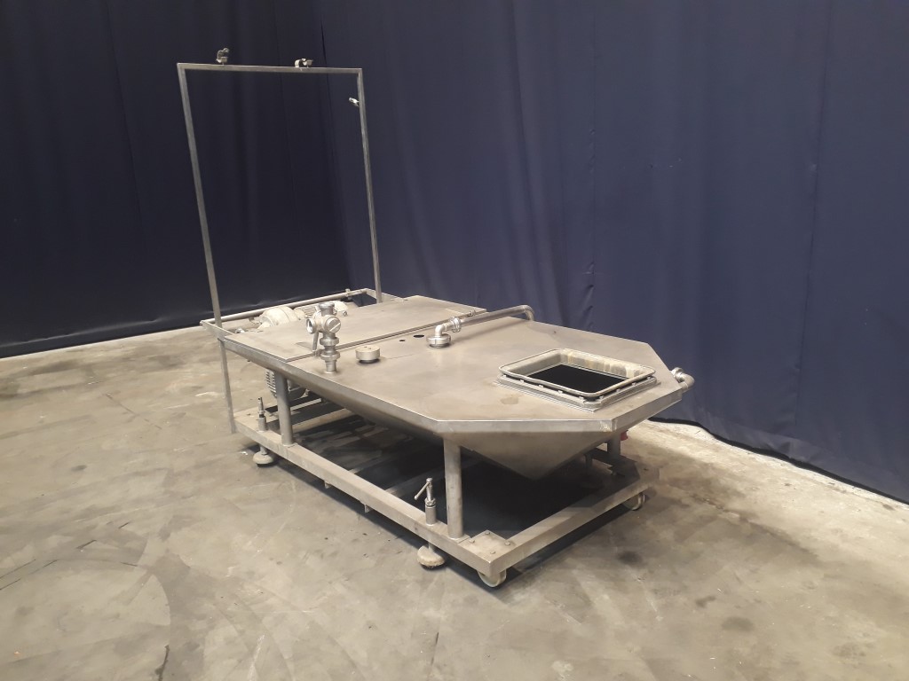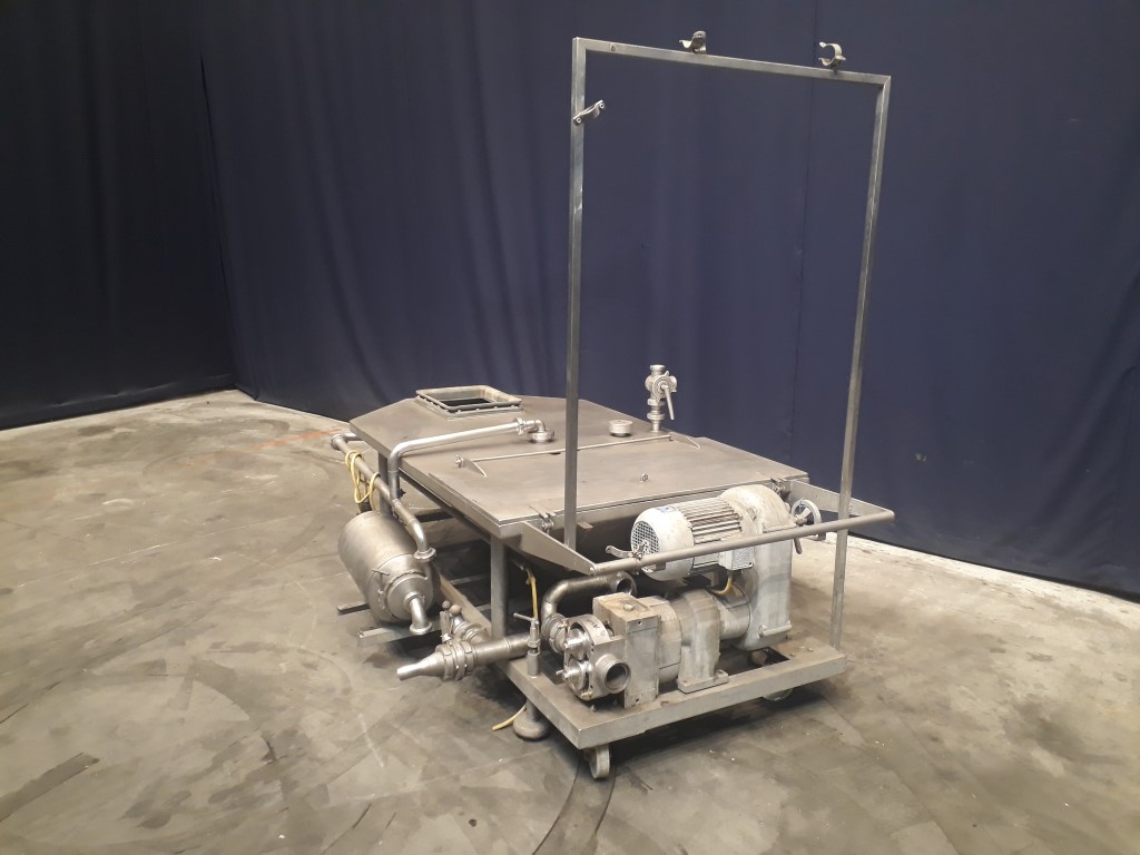 Stephan outfeed trolley. Has been running together with a Stephan TC/SK300. Movable outfeed trolley (volume +/- 280 ltr), cip cleanble with positive lobe pump (Fristam FKF40/45, 4 kW, 6000 ltr/h) and CIP centrifugal pump (1,5 kW).