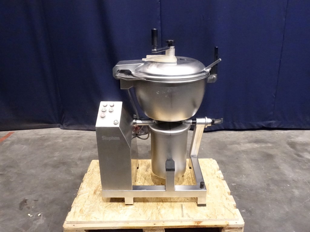 Universal vertical mixer and cutter. The main product bowl, cover and frame are stainless steel. Bowl is single jacketed. No vacuum. The main lid has 1 clamp, manual tightening and a small inspection hatch. 2 Agitators: 1 scraper agitator (manual driven) and 1 mixer knife. Main motor: 4 / 5,5 kW, 1500 / 3000 rpm. Including controls.