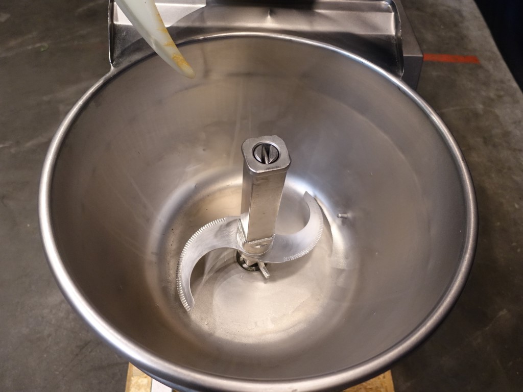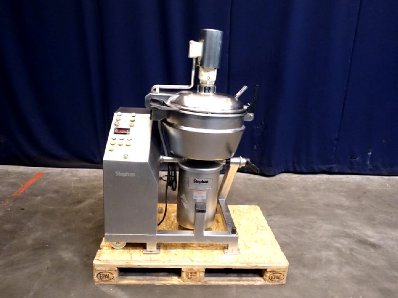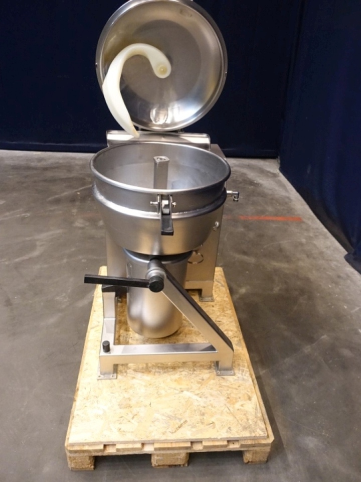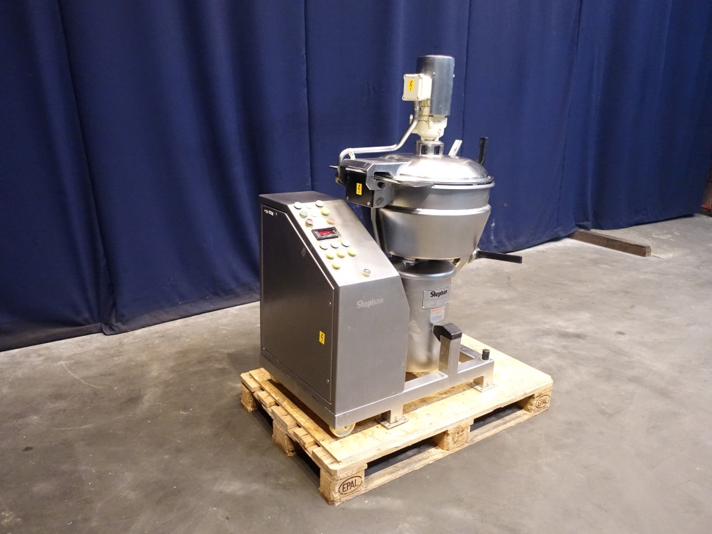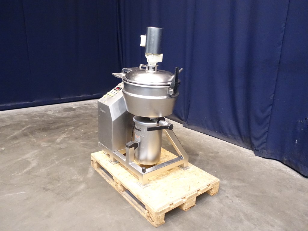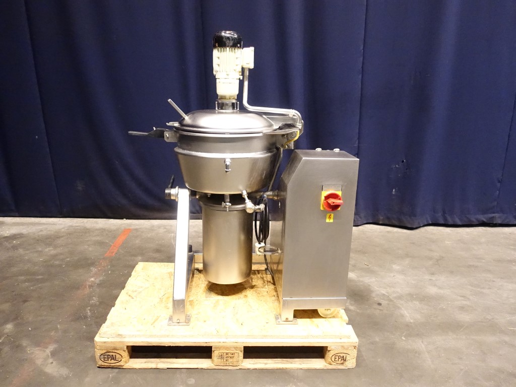 Universal vertical mixer/melter/cooker. The main product bowl is double jacketed for cooling or heating. PT-100 sensor in the bowl. The main lid has 1 clamp manual tightening. 2 agitators: 1 plastic agitator wing (25 rpm) and 1 mixer / homogenize knife. 3 speed Main motor 2,2 - 4 - 5,5 kW, 750 - 1430 - 2880 rpm. Design pressure bowl vacuum -1 bar to athmospheric. Including control cabinet. Total dimensions: 100 x 80 x 160 cm.