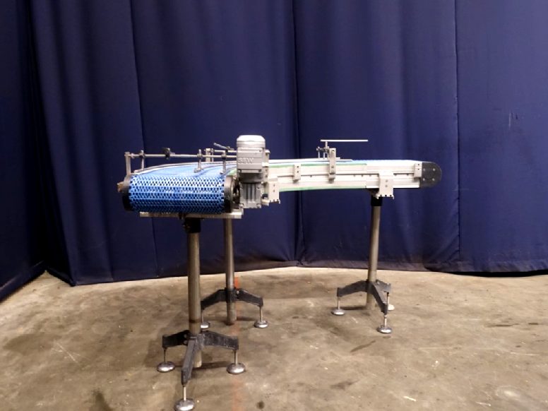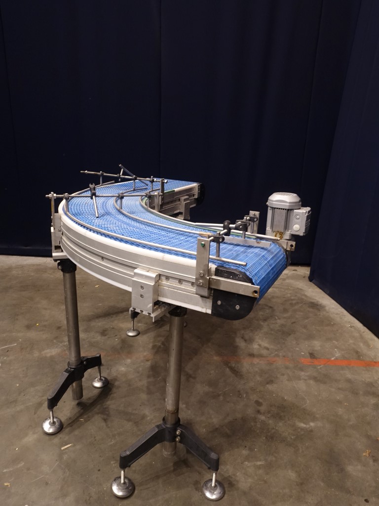 Chain conveyor. Effective Belt width: 38 x 210 cm. 90 ° corner. Motor: 0,25 kW - 0,73 A - n1: 1600 rpm - n2:82 rpm. Horizontal.