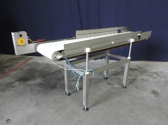 Horizontal belt conveyor with stainless steel frame. Effective belt dimensions: length: 210 cm, width: 40 cm, belt height: 100 cm. Drum motor. Total dimensions: 240 x 60 x 105 cm.