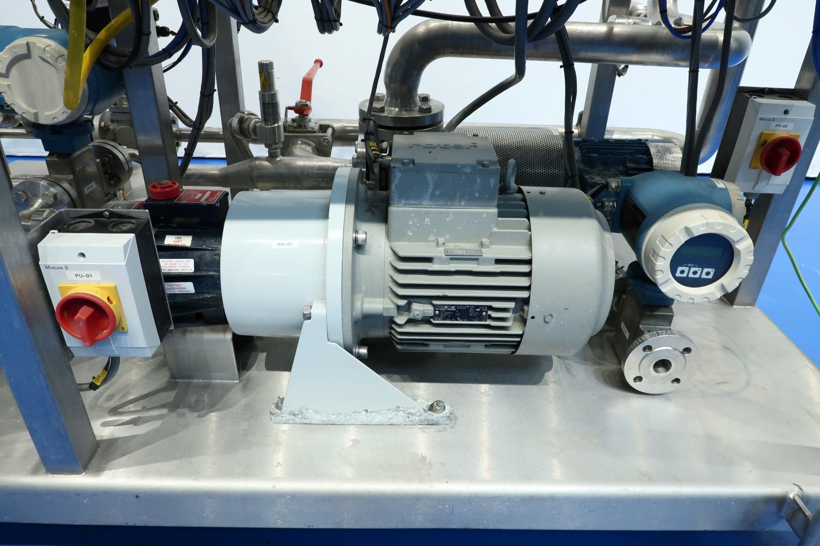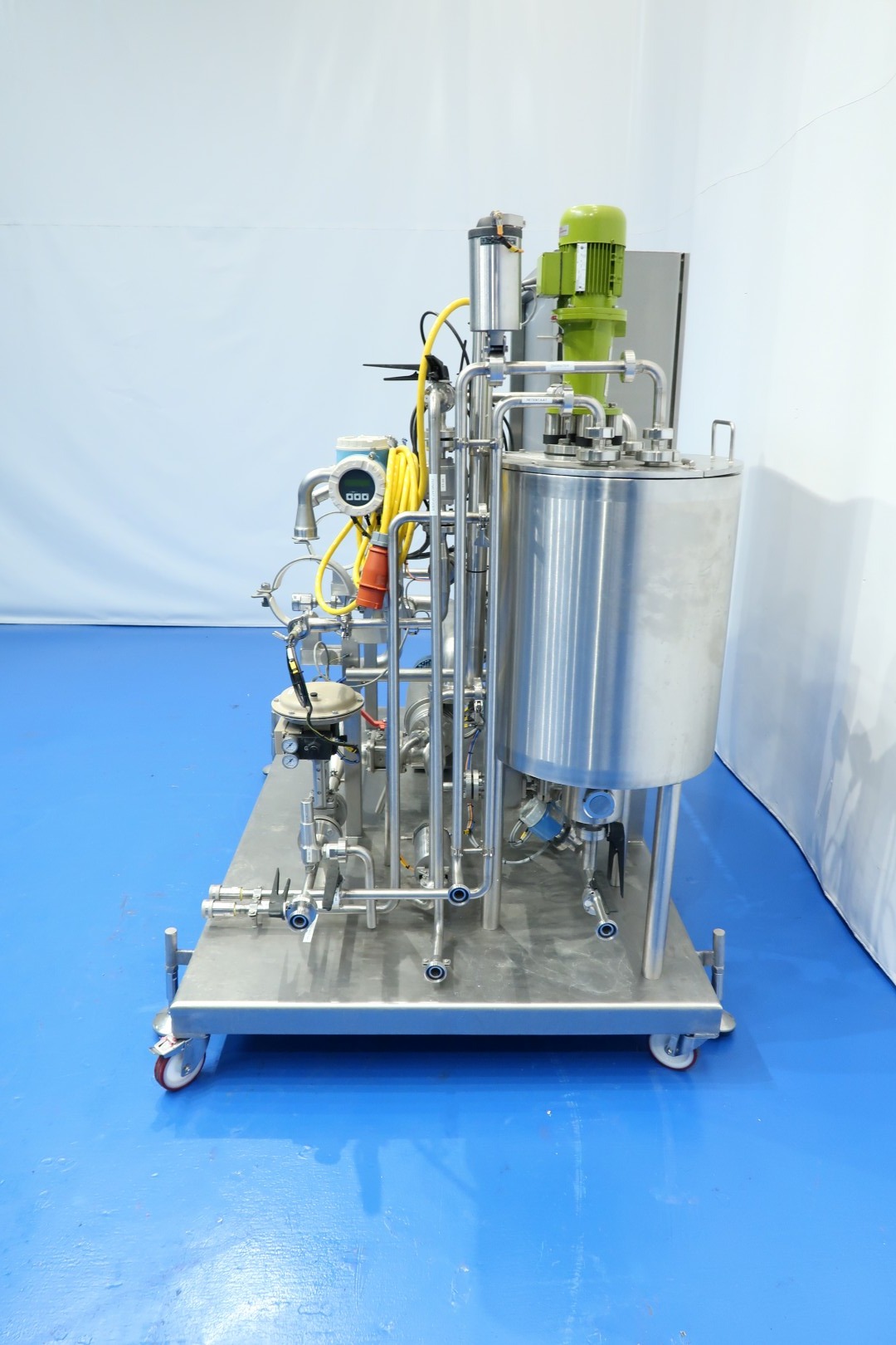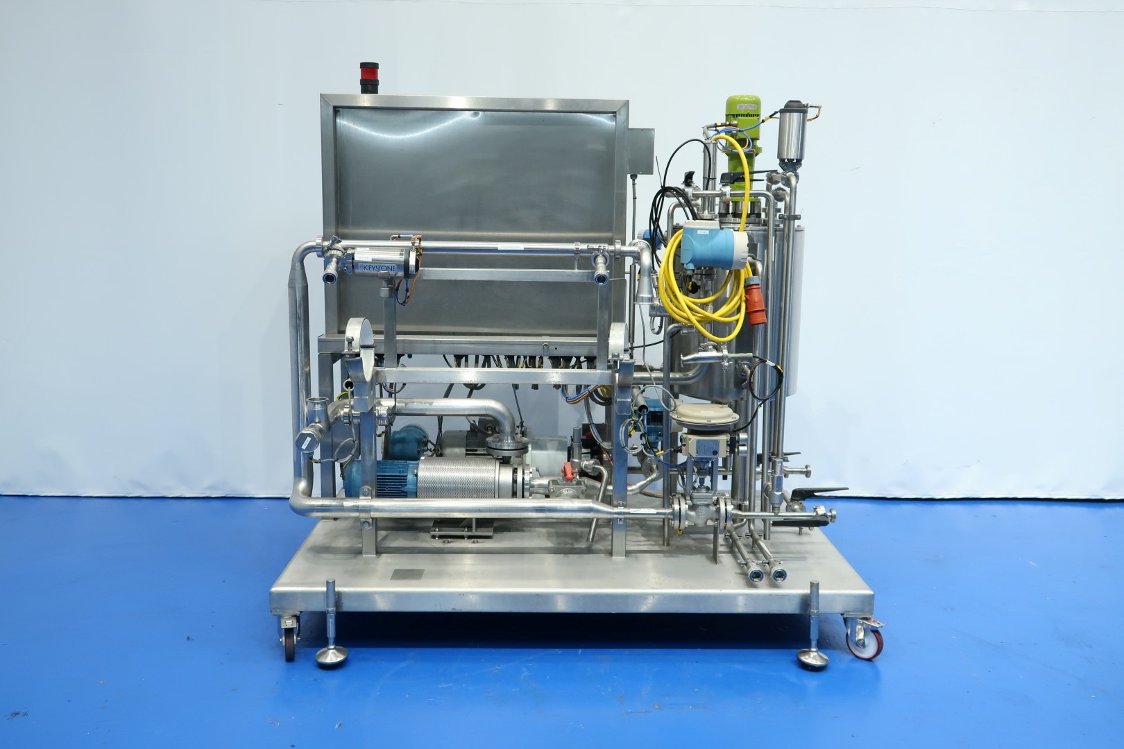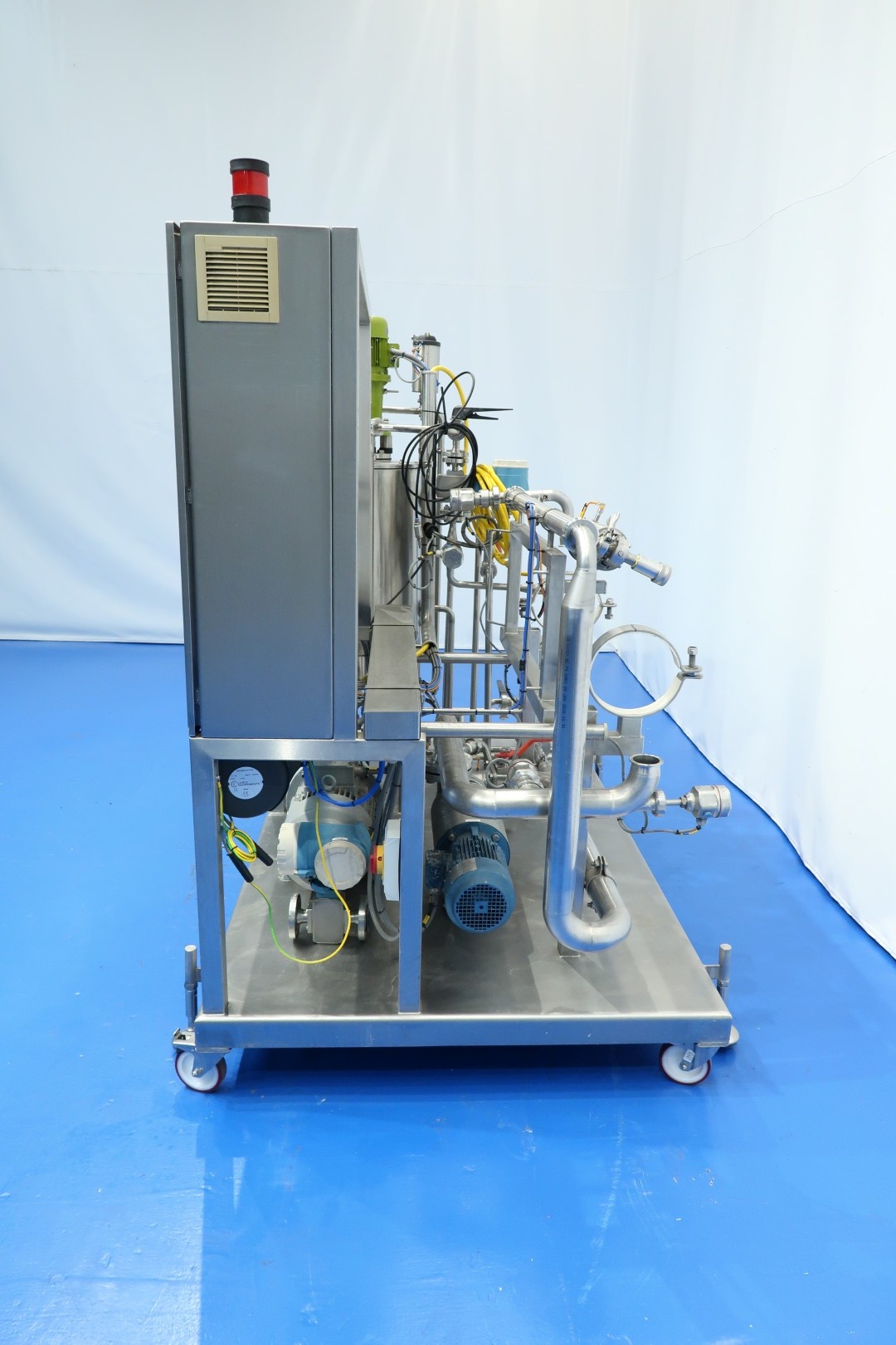 Pilot Filtration plant, Used for NF/RO Filters (but also MF/UF possible), Reverse Osmosis unit (prepared but without 8" filter housing). Build on mobile stainless steel frame with 4 x adjustable feet. Double jacketed balance vessel, capacity 100 liter with 2 x level sensor and 1 x temperature sensor with Typhoon 03TY0196 mixer (round blade) 0,44 kW- 1.690 rpm. With 3x E&H flowmeter. With Hydra-cell pump model G10XDS0SFEMB (high pressure up to 103 bar - viscosity 1.000 mPa.s - piston diaphragm pump - seal-less design). Motor of Hydra-cell pump: 3 kW - 7,2 A - 949 rpm - 50 Hz. With Samson steam valve and 2 x overpressure valve. Tube heat exchanger for retentate cooling via ice-water. With centrifugal high pressure circulation pump make: Pomac pump. With Simatic op7 operator panel. Controls Siemens Simatic S7-300 in e-panel 3x Siemens frequency converter and E&H data recorder. Documentation: electrical scheme available. Total dimensions: 200x140x203 (lxwxh) cm - weight: 695 kg.