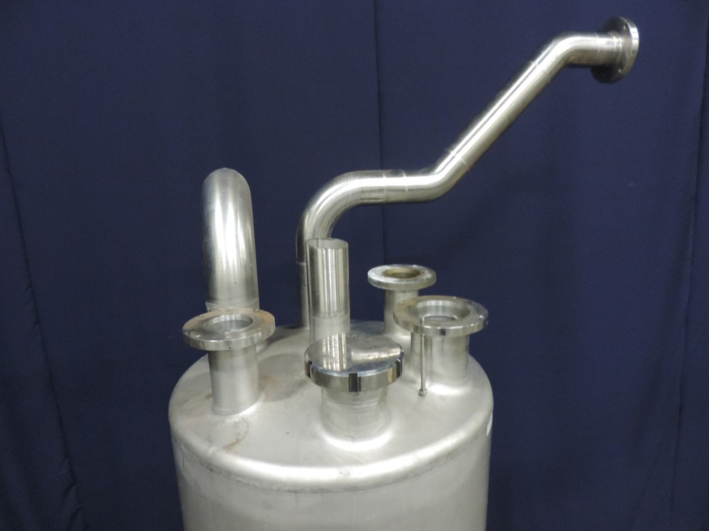 Waste water collection tank. Single jacketed leveltank. inside measurements: diameter 60cm, height 125cm, approx 350 liters. 7x connections on the top (2 x 4'', 4'' breather, 4 x3''). Outlet with valve at the bottom 4'' DIN, outlet height: 20 cm.