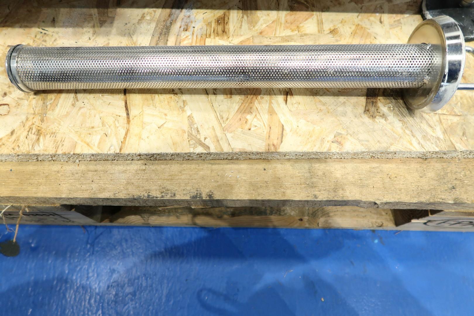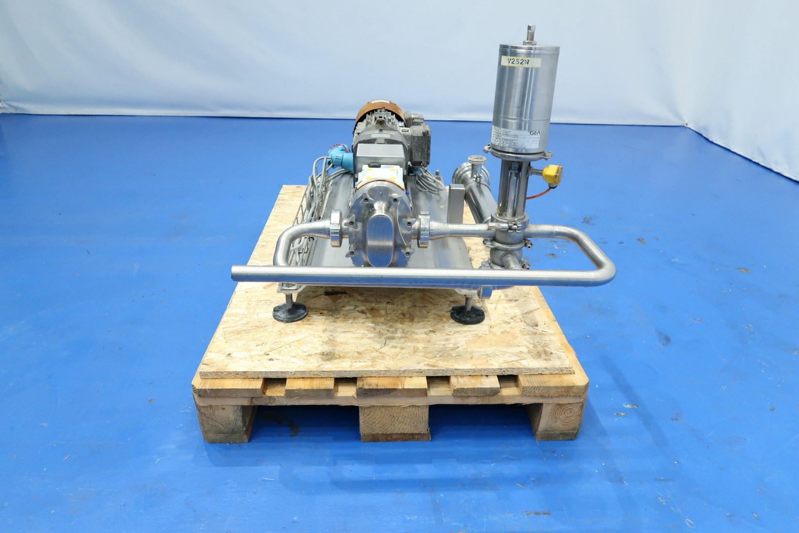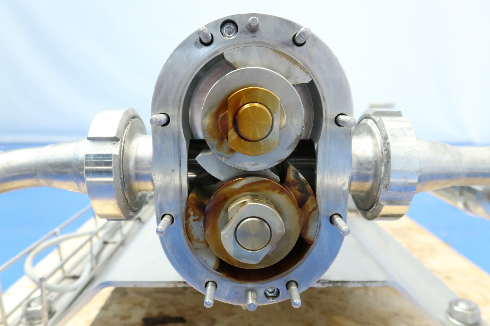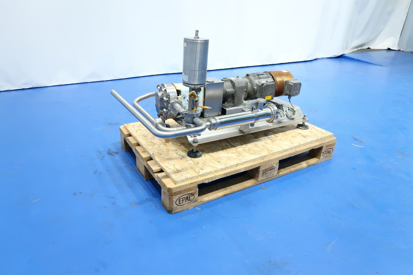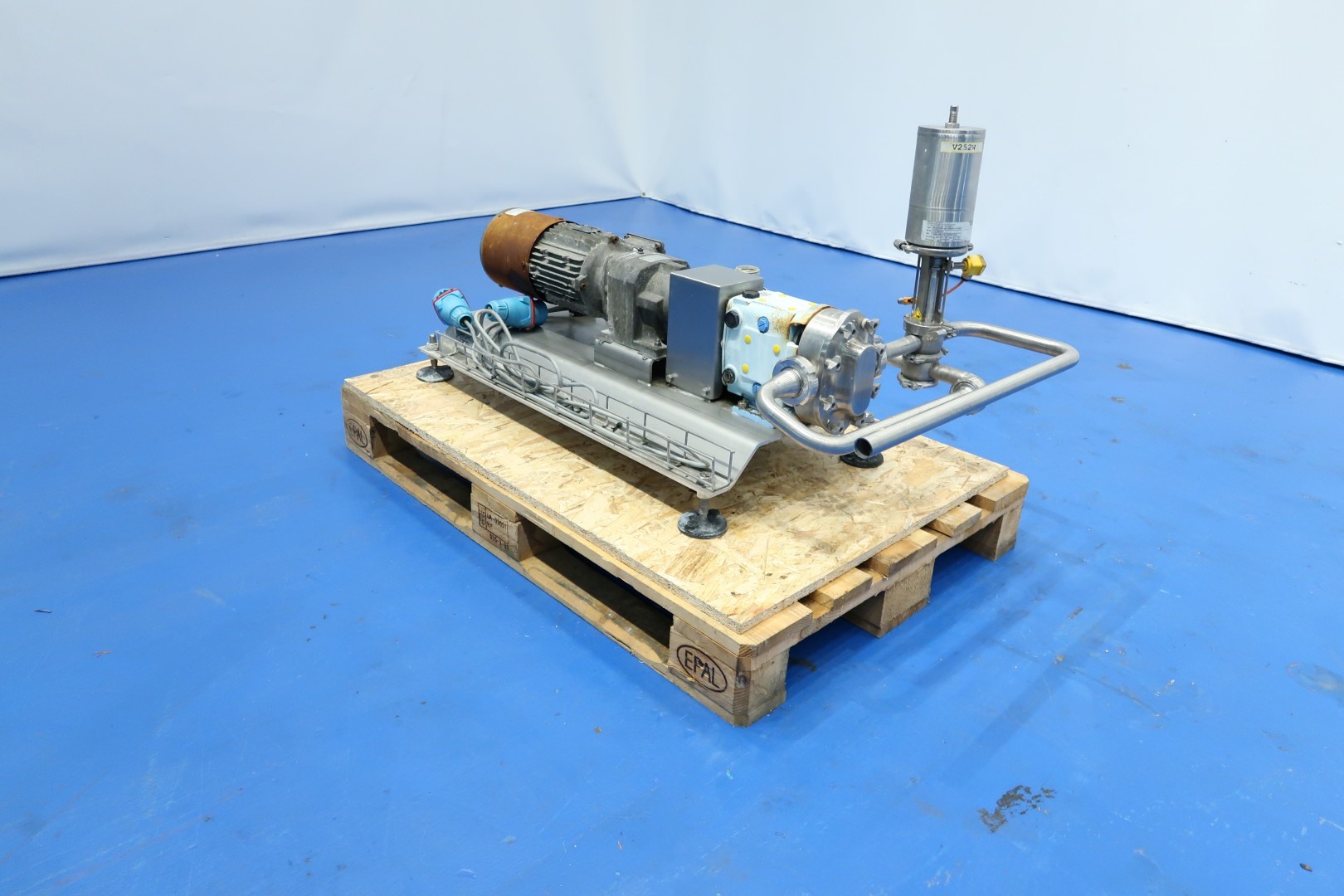 Lobbe pump with duo stainless steel lobbes. Diameter lobbes: 85 mm. Displacement per revolution: 0,110 ltr. Nominal capacity 3,8 m3/h. With bypas with 4-way valve and pipe filter (hole perforation Ø 1,4 mm). Current drive work: motor: 1,5 kW - 3,34 A - n1: 1.415 rpm - 50 Hz. Forced cooling on the motor. Design pressure up to 10 bar. Mounted on SS plate with adjustable feet. Connections: (in) DN40 Din / (out) DN40 Din. Dimensions: 120x65x63 (lxwxh) cm - weight: 114 kg.