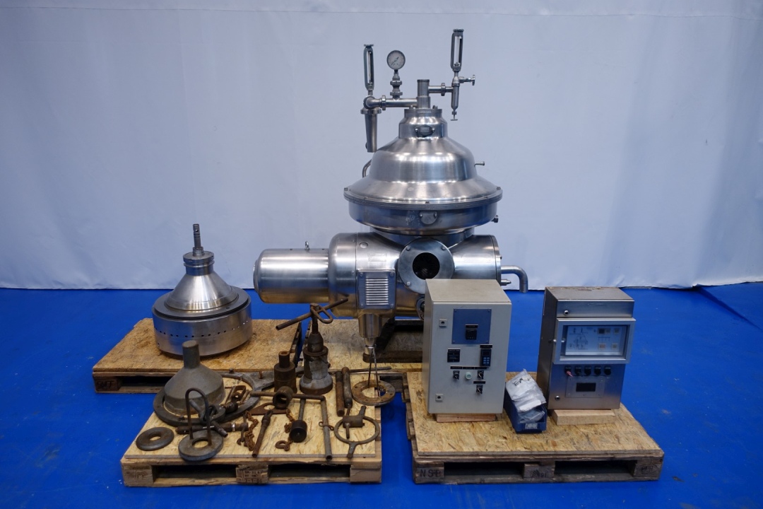 Milk or cream skimmer, self cleaning. Including bowl, motor cover, base foundation frame, flow indicator and pressure manometer outgoing milk. Flowindicator and manual flow regulation valve for cream. Motor 22,0 kW - 50 Hz. Bowl speed 5.920 rpm - solids 1,1 kg/dm3. Liquid clutch. Set of needed tools with ring key and. Free standing control panel with standard Westfalia controls. Documentation available (in French).